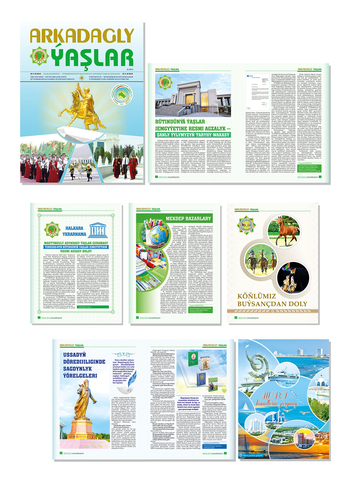 The article “Bilim dünýäsinde bagtly ýaşlar biz”, dedicated to the Knowledge and Students’ Day, will be of great interest to readers. The article “Kalplary Gün kimin çoýýan sungat” tells readers about the handicrafts made by Ogulabat-eje, the mother of our Hero Arkadag, which were donated to the State Museum of the State Centre of Culture.