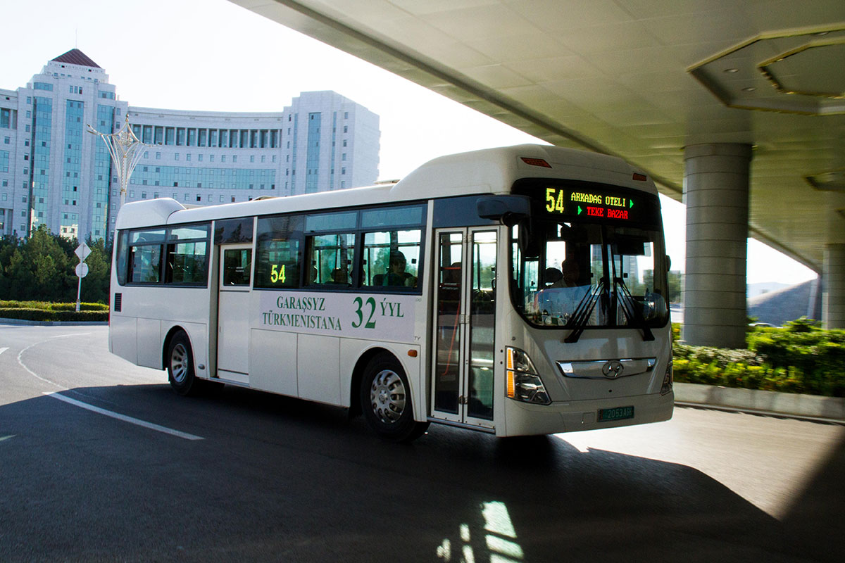 Festive slogans decorated city transport. Buses with the inscriptions – "Arkadag Serdarly bagtyýar ýaşlar", "Arkadagyñ ýoly – ak geljegiñ ýoly", "Döwlet adam üçindir!" and "Türkmenistanyń Garaşsyzlygynyń 32 ýyllygy" travel along the wide avenues of white marble Ashgabat.