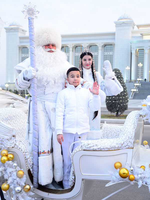 ...The heroes of this New Year’s story, during a tour around Arkadag city, visit the State Drama Theater named after Aman Gulmammedov, where they are joyfully greeted by children. Then, at the State Equestrian Circus named after Gorogly, the group of national equestrian games Galkynyş demonstrated their horse riding skills to the guests.