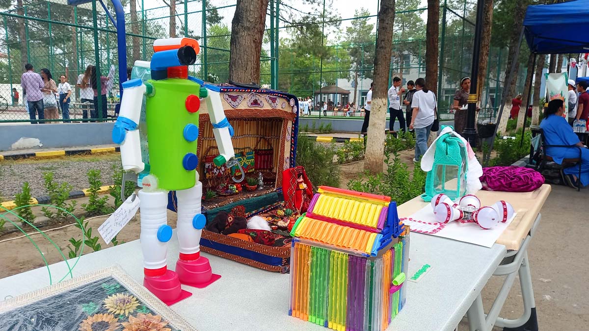 Additionally, an exhibition of handicrafts made from recycled materials was held at the festival venue. Many original works were submitted to the contest previously announced by the "Ýaş Tebigatçy" Public Organization, including handmade products by Mukhabat Berdiyeva.