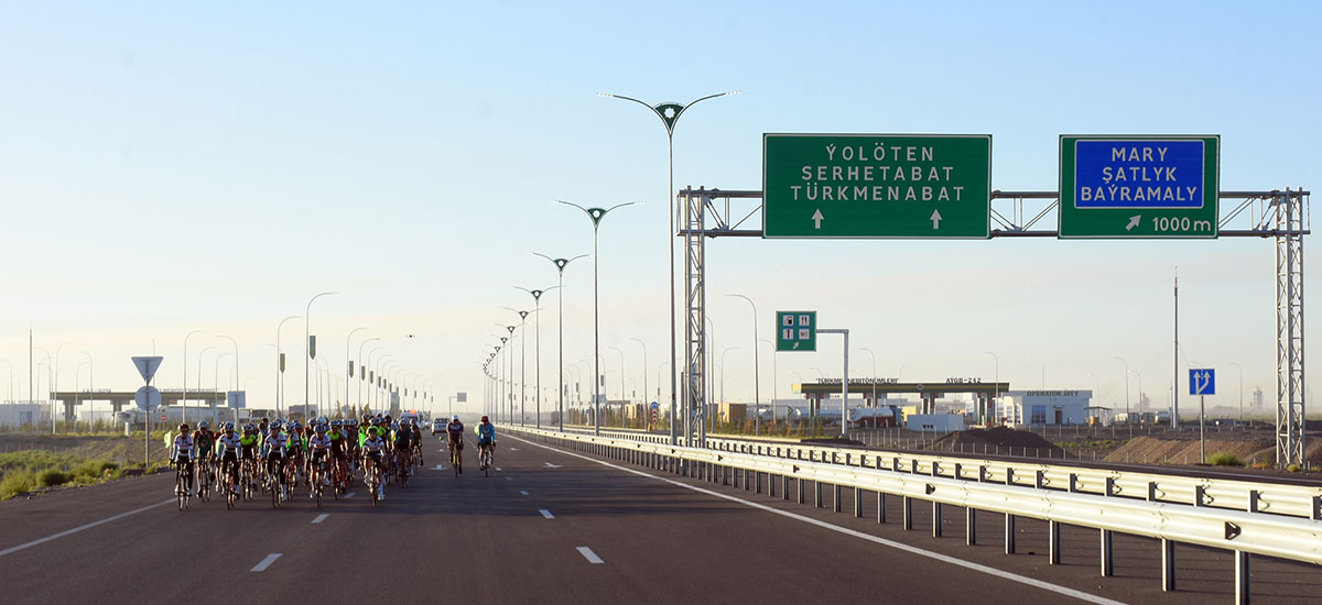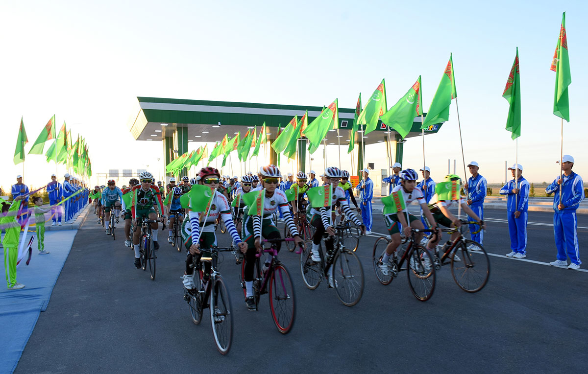 And today, a cycling marathon started in the administrative center of Mary velayat, which for four days will follow a special 335 km route along the Mary-Tejen-Ashgabat high-speed highway, which is part of the 600 km Ashgabat-Turkmenabat autobahn under construction.