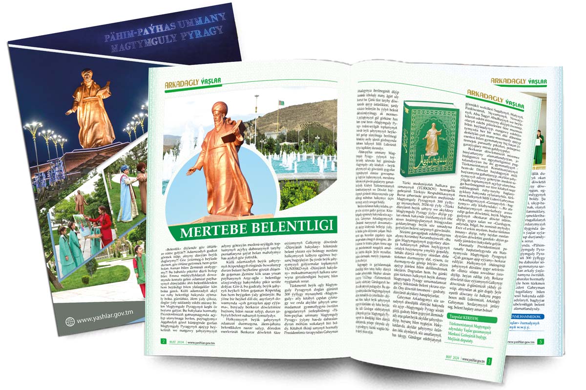 This issue contains the article about the Science and Practical Conference “Magtymguly – geçmişimiz, şu günümiz we geljegimizdir’, organised by the Central Council of Magtymguly Youth Organisation and Magtymguly Institute of Language, Literature and National Manuscripts at the Academy of Sciences of Turkmenistan jointly with Balkan Мelayat Hyakimlik.
