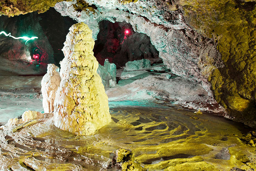 The caves feature speleothem formations of gypsum, calcite, aragonite in the form of stalactites, stalagmites, stone curtains, creating unique galleries, passages, halls and labyrinths.