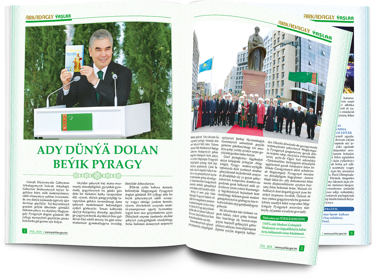 On the first pages of the new issue of their favorite magazine, readers can read an article about the new star of Arkadag. The article «Ady dünýä dolan beýik Pyragy» tells about the visit of the Hero-Arkadag to the Republic of Kazakhstan in July this year and its results.