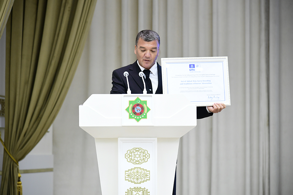 At the ceremony, Ms. S. Miculescu, President of UNESCO General Conference, congratulated the connoisseur of Akhal-Teke horses Hero-Arkadag and the President of Turkmenistan, as well as all Turkmen people, on this significant event with great importance in the country's life, and presented the certificate of including the national nomination "Art of Akhal-Teke Horse Breeding and Traditions of Horses’ Decorations" in UNESCO List of Intangible Cultural Heritage of Humanity.