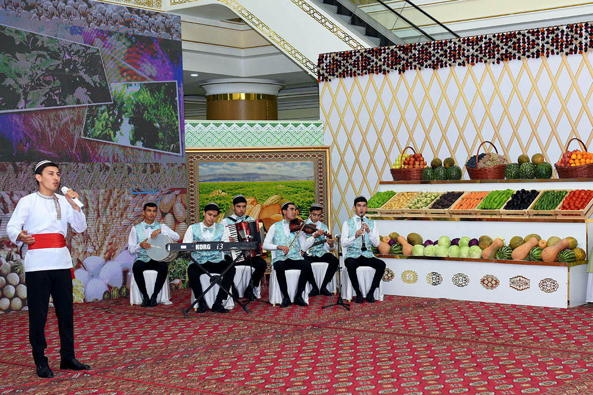 Leading figures from state agricultural enterprises and trade union activists gathered in the foyer, and a thematic exhibition was organized to showcase the variety of produce grown by farmers this year, including vegetables, grains, food and light industry products. The festive mood for the assembled veterans of the agricultural sector was enhanced by performances from artists of the Mai Kuliyeva Turkmen National Conservatory's folk instruments ensemble, as well as a student group "Miras Folklor" from the Institute of Culture, who presented a costumed composition "Hasyl toý."