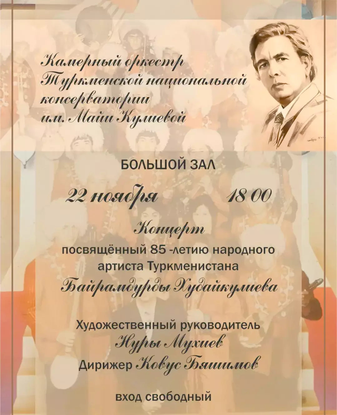 The memorable concert will be on November 22 at 18:00 p.m. It'll be a tribute and recognition of his irreplaceable contribution to music education of new generations of professionals. The Chamber Orchestra of the Turkmen National Conservatory under the artistic direction of Nuri Mukhiev and conducted by Kovus Byashimov will perform at the concert. Admission is free.