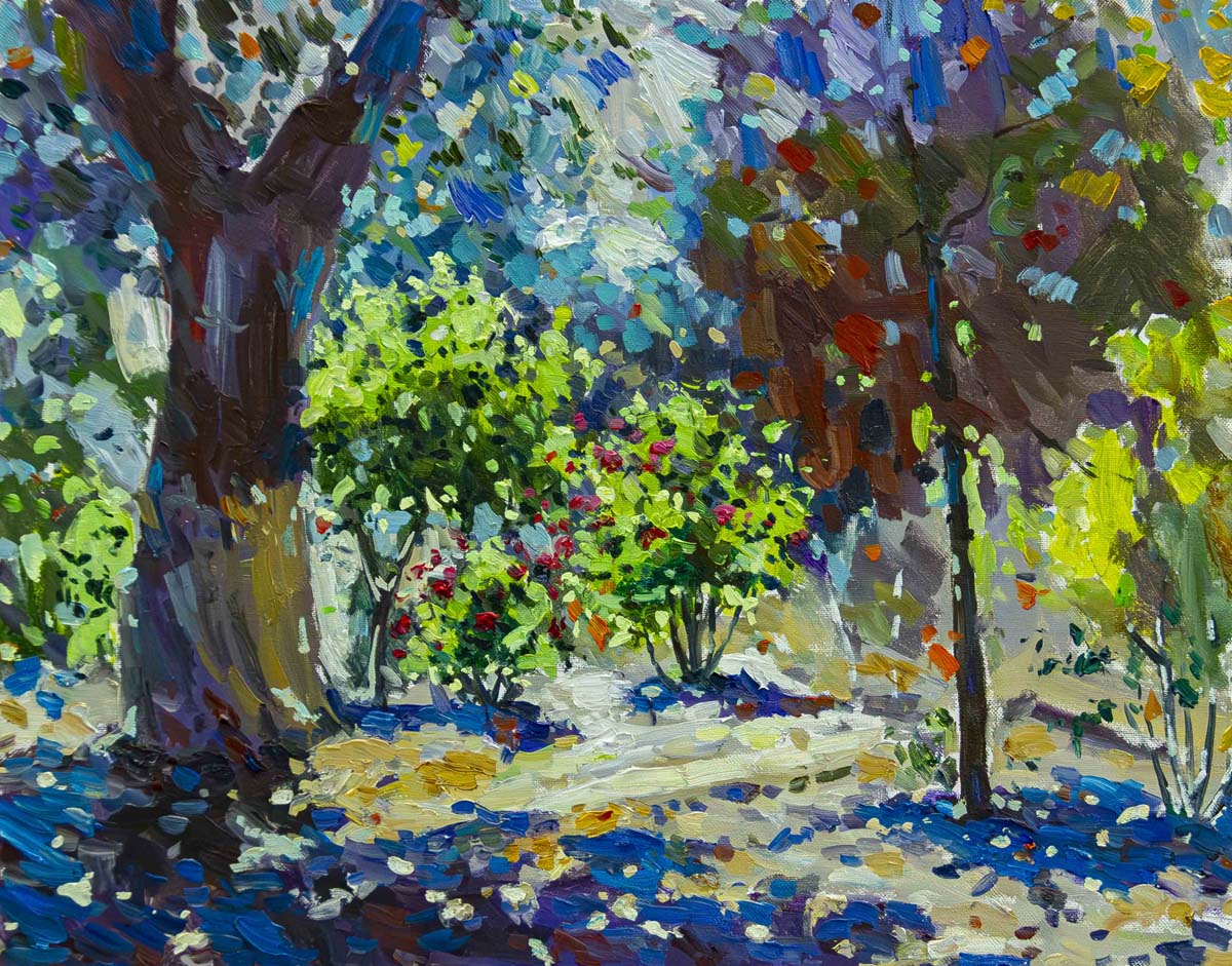 The painting "Moon Mountains" by Shagylych Ataev stood out with its yellowness. Many artists dedicate their work to the lunar mountains, which are located near Kary-Kala. But Shagylych Ataev, overlapped with sunlight, the mountains look in a special way. Next to this work is the “Landscape” of the Myalik Gochmuradov. Myalik used point technique - pointerism. The trees depicted in the landscape create a depth of thicket due to the transition of blue points into dark green. The landscapes of the Myalik Gochmuradov can be found in different places of the exhibition, and everywhere they are recognizable.
