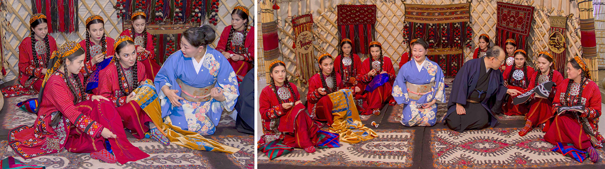 A rich exchange of professional experience took place during an open lesson at the Turkmen State Institute of Culture. Warmly welcoming the guests with traditional Turkmen food – pishme, the representatives of the university conducted Japanese guests to the dance hall, where they were greeted by a creative surprise from the participants of the folklore and dance group "Miras".