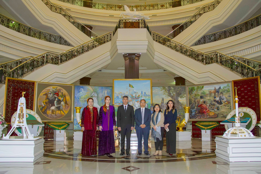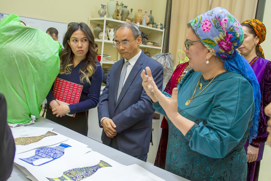 The guests were introduced to the academy's "golden fund," which houses the best graduation, coursework, and competition works by students from various years. As part of the tour, the administration and faculty of the institution acquainted the delegation with the history, art, traditions and customs of the Turkmen people.