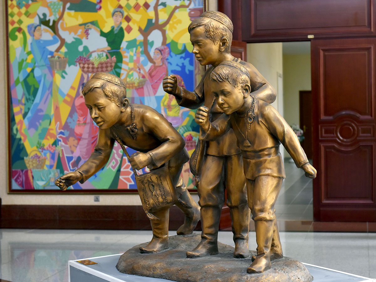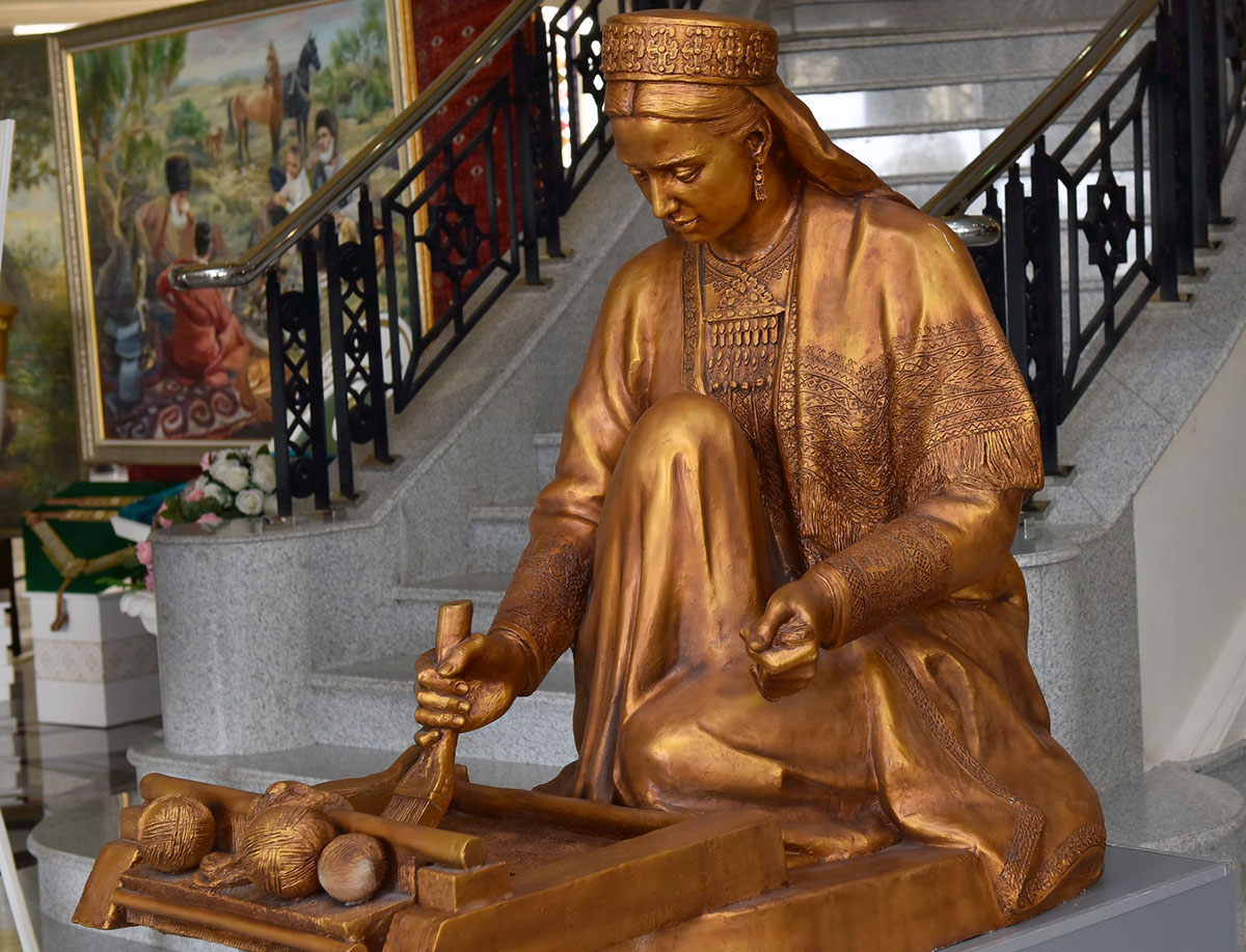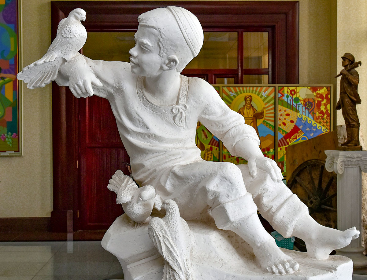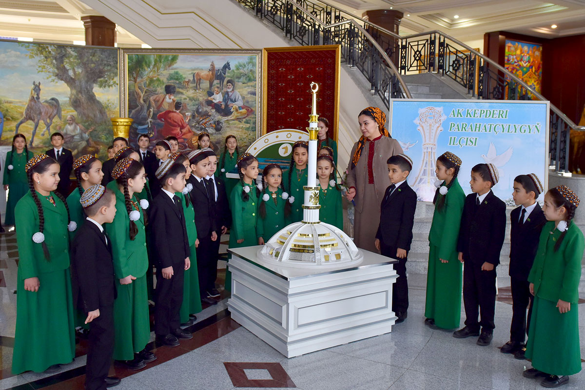 The "White Dove – Messenger of Peace" initiative will also be remembered by young citizens for a guided tour of the State Academy of Arts. The main exhibit of this event was Akhmet Gurbangeldiyev's sculptural composition "Peace." The sculpture depicts a boy playing with white doves, unaware that they are messengers of peace. For him, they are friends—loyal and beautiful—capable of soaring through clouds or trustingly landing on his hands and shoulders. The guests of the Academy visited the museum of the university’s Golden Fund, where they explored exhibits with great interest. With childlike curiosity, boys examined sculptural compositions such as "Football Players" and "Playing Alchiks". The girls were captivated by the sculpture "Princess Playing Chess." Meanwhile, everyone admired the composition "Devoted Family." Sculptor Selbi Jumadurdyeva created a family of Alabai dogs in plaster and then painted their coats. The artist also managed to capture expressive eyes for each family member. This sculptural composition won first place at a competitive exhibition in 2023 dedicated to Turkmen Alabai Day.
