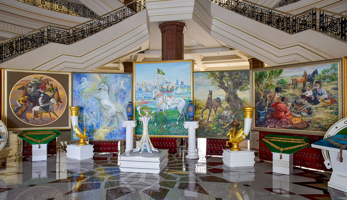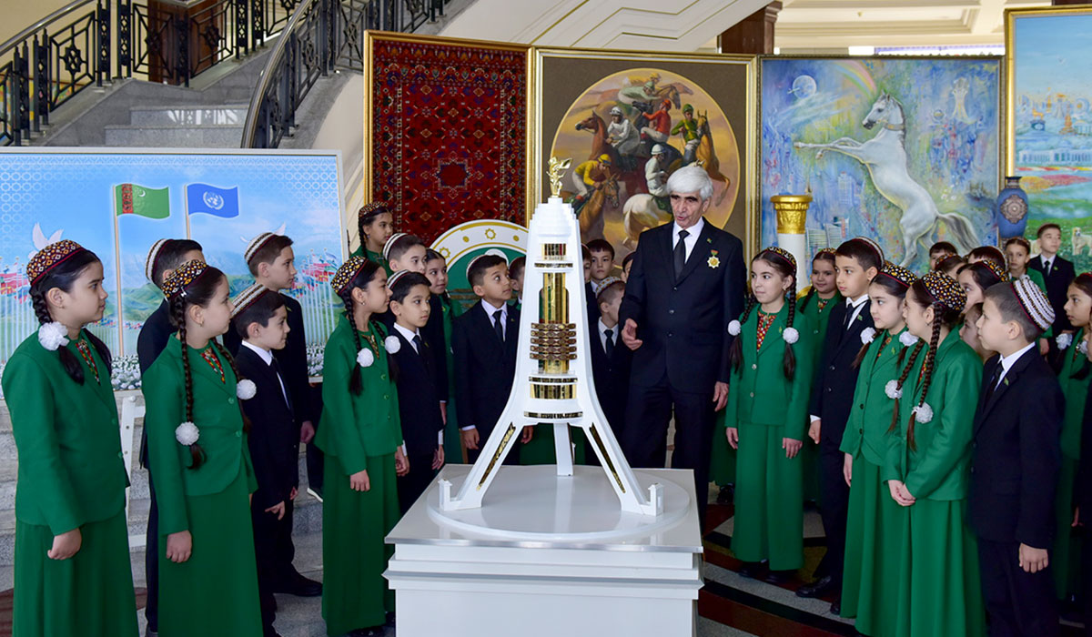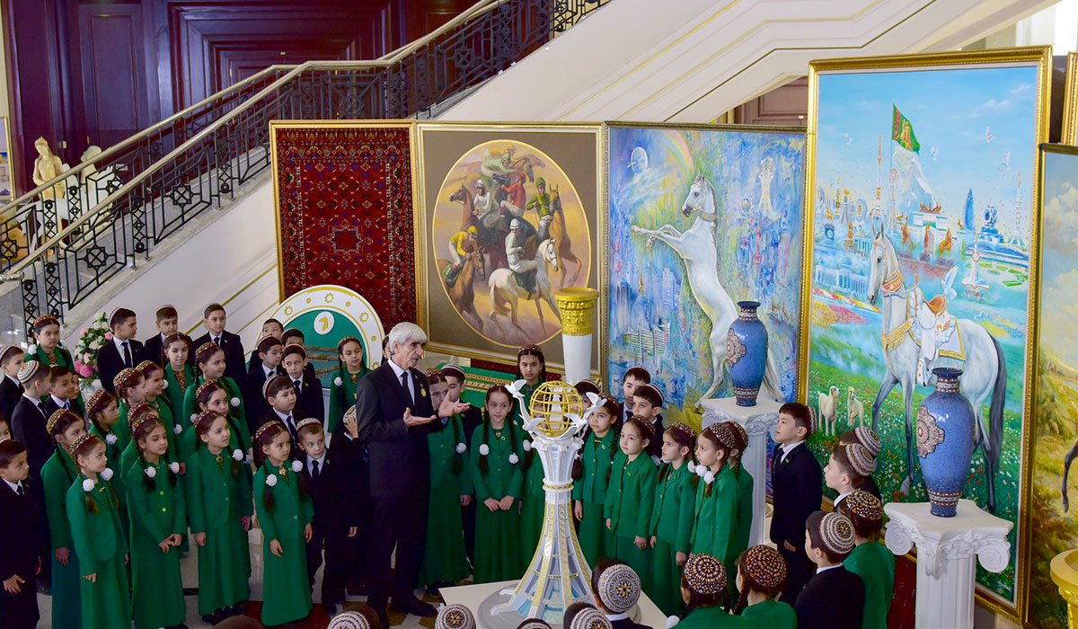 In the foyer of the Academy, elementary school students from Ashgabat were welcomed by an exhibition showcasing the emblem of 2025, models of monuments adorning the capital, as well as original sculptures from the museum of the Golden Fund of the creative university.