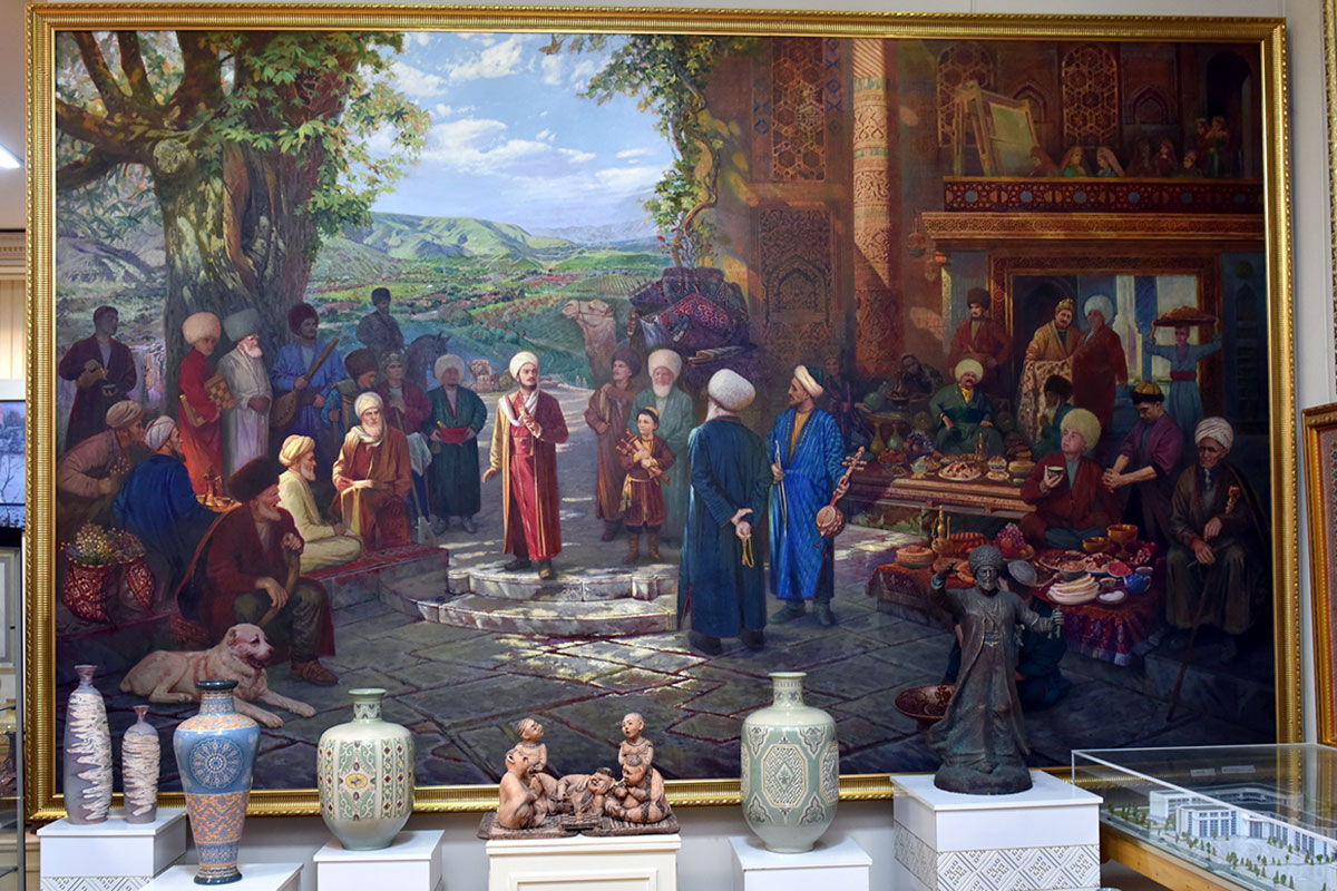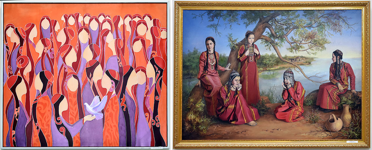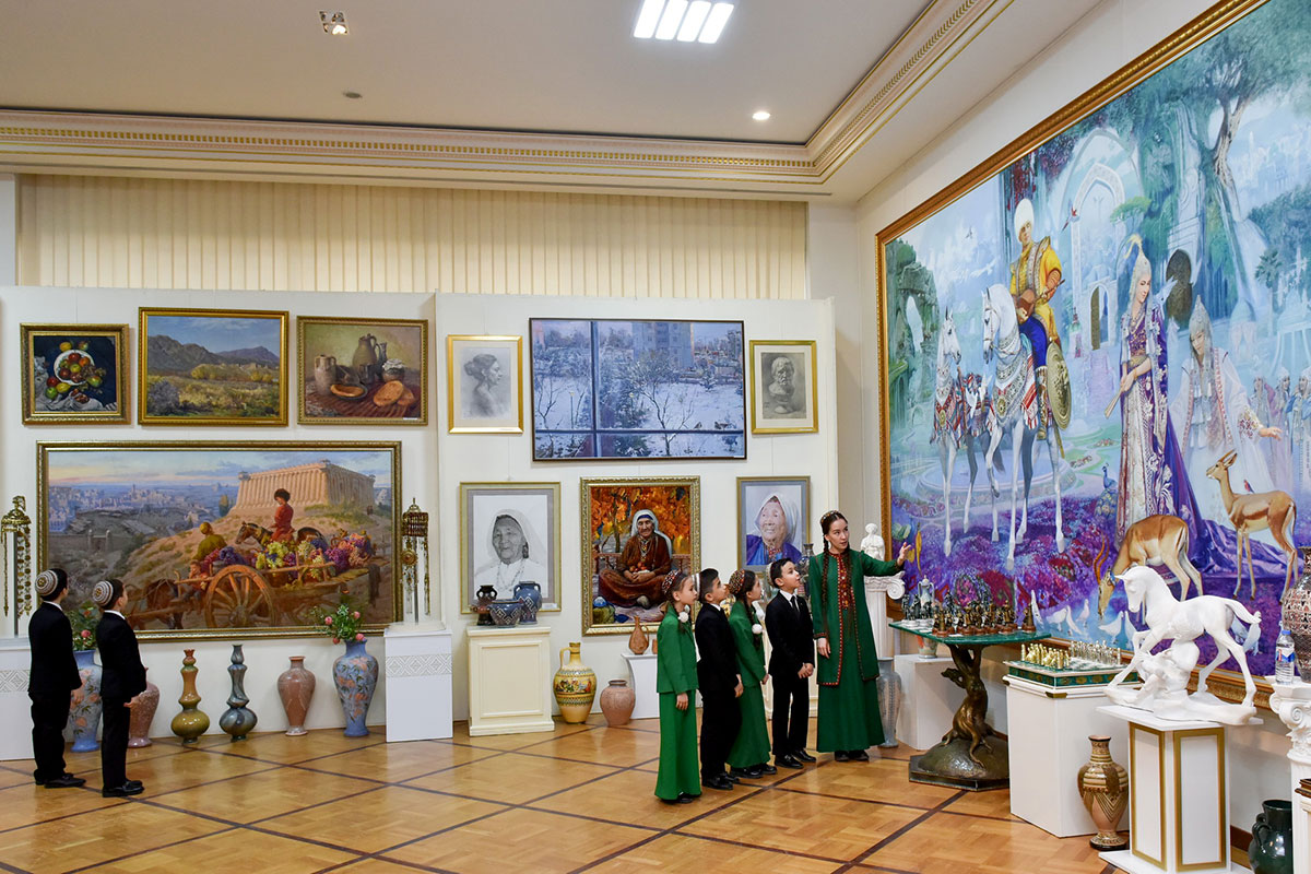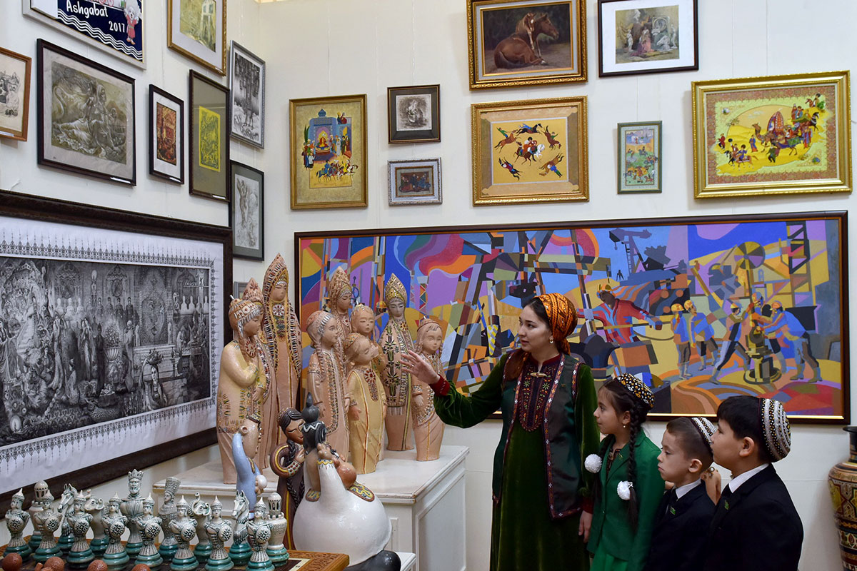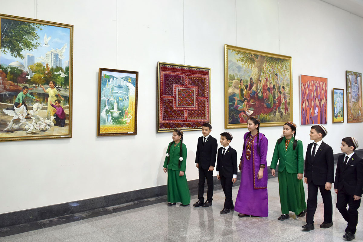 The tour continued in the gallery, where specialists drew young visitors' attention to works featuring doves. Among these were "Harbinger of Peace" by Lachin Taganova, "Project" by Jeyran Umarova, "Prosperity" by Aksoltan Hommadova, "Melegush" by Rustam Haitov, and others.
