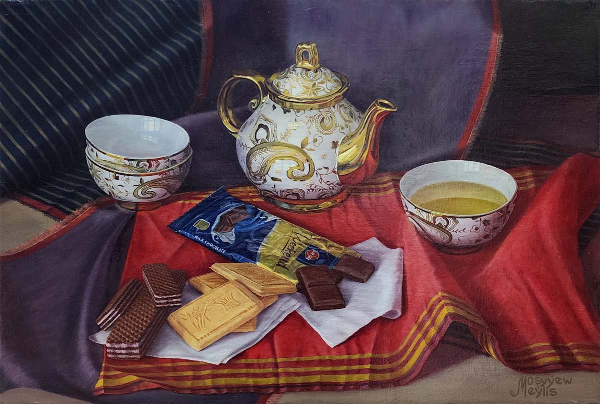 Finally, I want like to reveal one of the main secrets in the paintings of Meylis Moshiev. They should not be viewed from a distance, like most works done with oil paint strokes, but as close as possible to approach them. And then you will not just see an exact copy of the depicted object, you will see this object in reality.