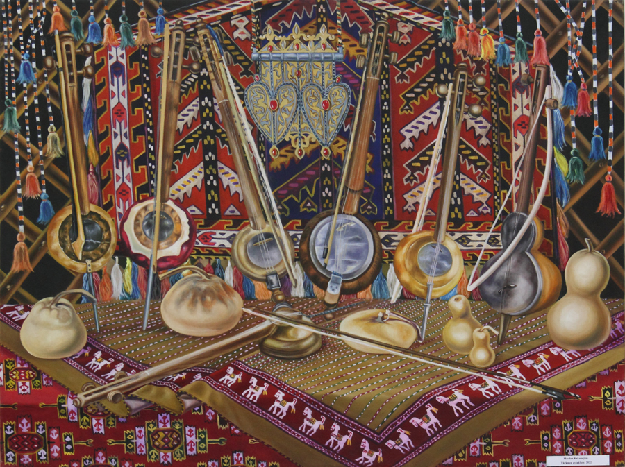 Merdan Babajanov carefully depicts ethnographic exhibits related to agriculture in his still life "Heritage." The artist is deeply moved by archaeological finds from Margush, Nisa, Anev, and other historical monuments of antiquity. Another direction of his creativity is folk musical instruments. In one of his still lifes, he depicted a gijak next to pumpkins. It turns out that one of the main parts of the gijak – a circle – is made from a specific type of pumpkin.