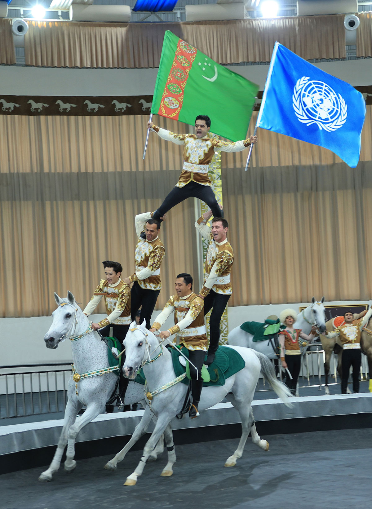 Having thanked actors for their inspiring performance, the head of the state passes to the indoor arena, on which the equestrian art group «Galkynysh» displayed its show. The group won the Gold Award and other special prizes at the 47th International Circus Festival in Monte Carlo in the Principality of Monaco as well as a number of other prestigious international awards, bringing a big contribution to wide popularisation of the national circus art in the world. Besides it, equestrians of the «Galkynyş» group take part in celebrations and cultural events all over the country on the occasion of significant dates, raising their prestige.
