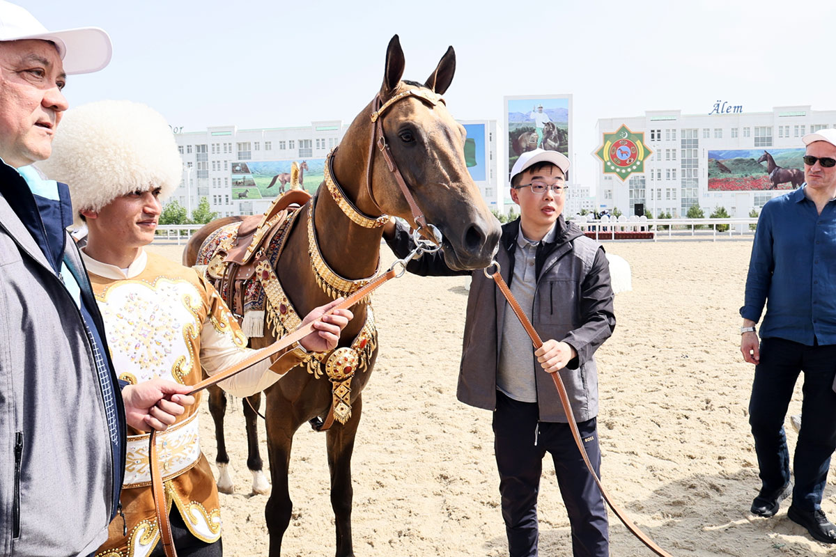 In honour of the national holiday of the Turkmen horse on behalf of residents of Akhal velayat fine horse Arkach, from Balkan velayat – race horse Gazal, from Dashoguz velayat – race horse Diyar, from Lebap velayat – race horse Gunesh, from Mary velayat – race horse Palvan, from the city of Ashgabat – race horse Ynamly, on behalf of horse breeders from Arkadag city – race horse Parahat were given as gift.