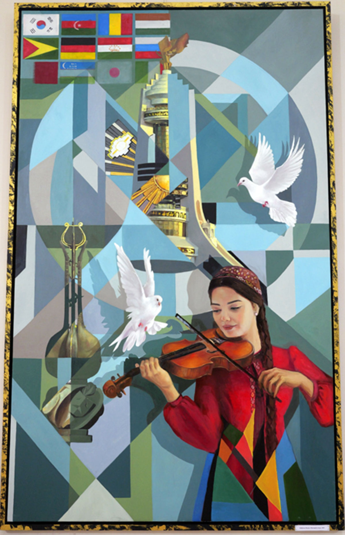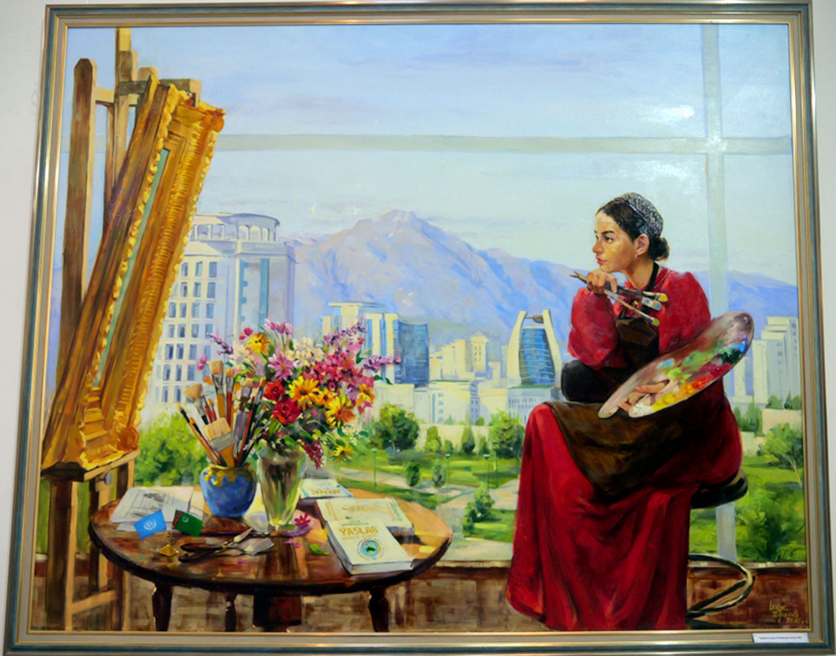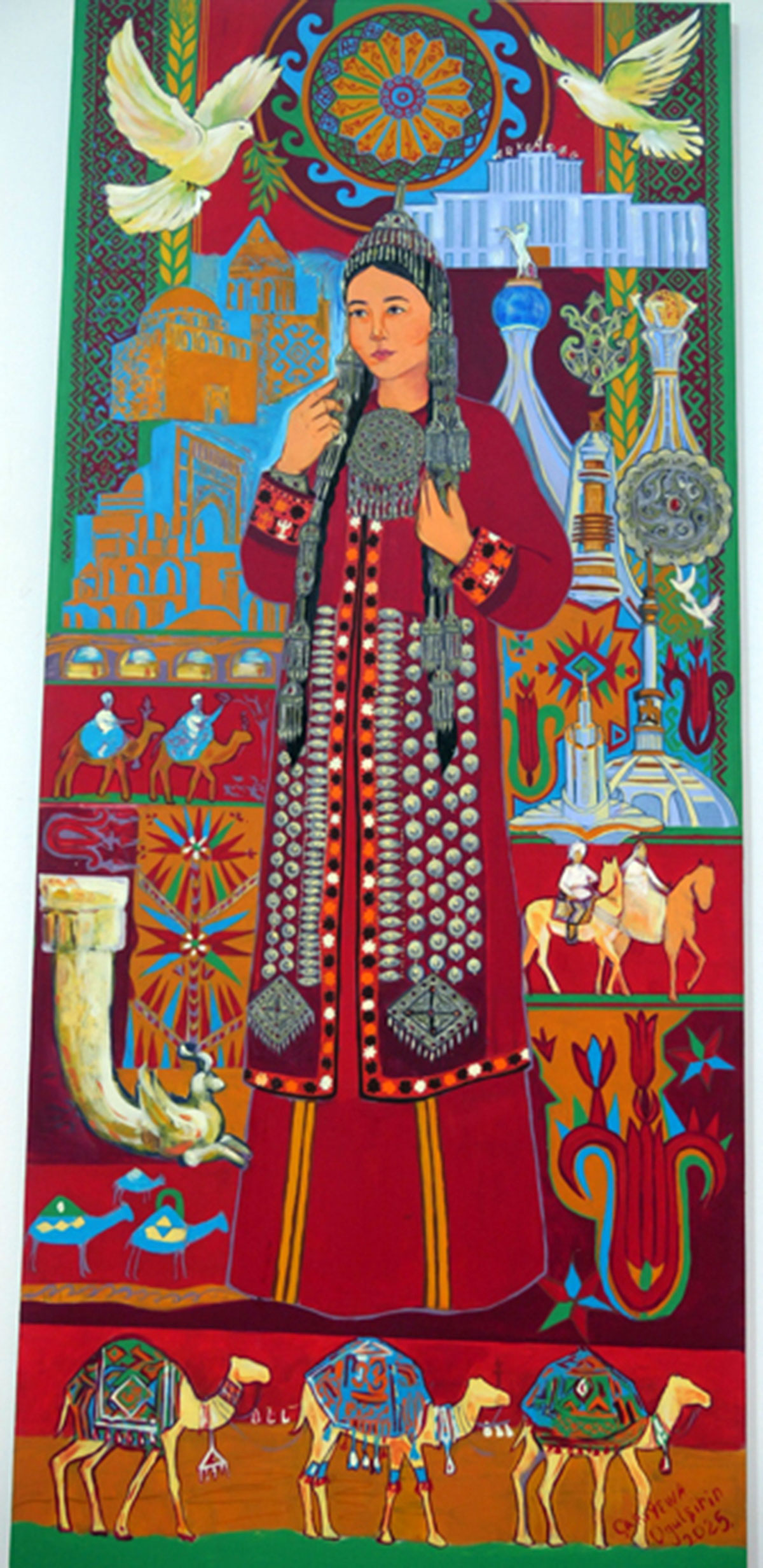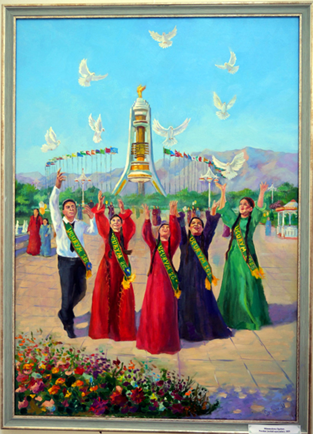 Almost every exhibition in the gallery of the Academy promises a pleasant discovery of a new work. Such a work at this exhibition was the painting by Annasoltan Hojayeva «Turkmenistan - the Homeland of Peace and Trust».
