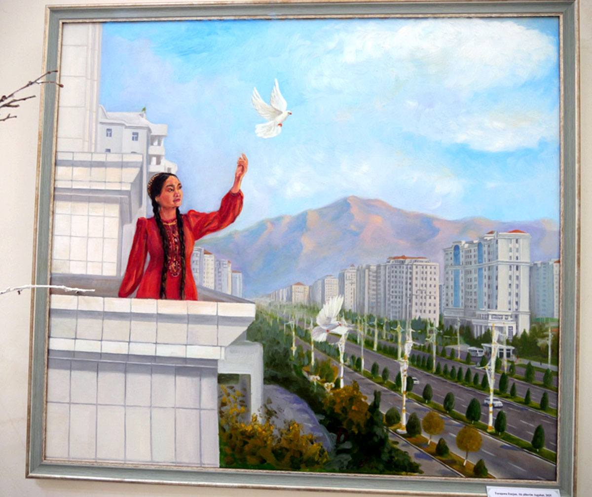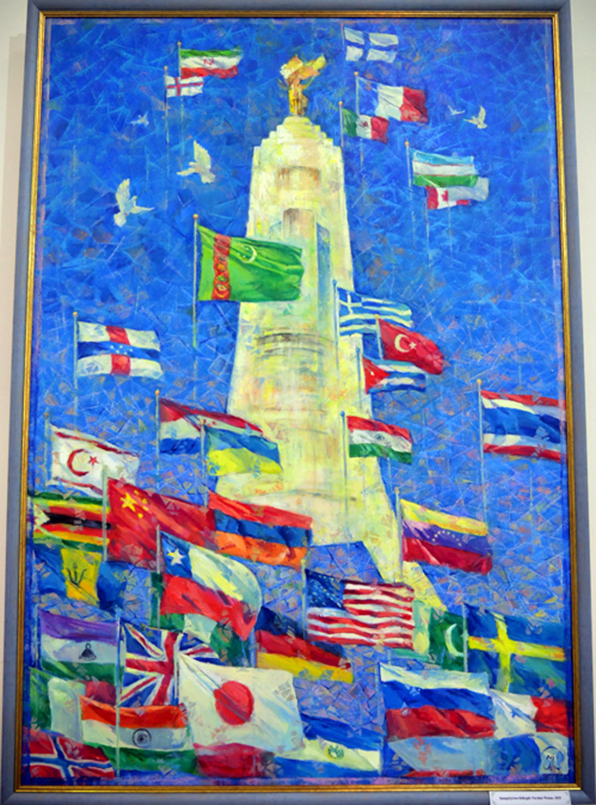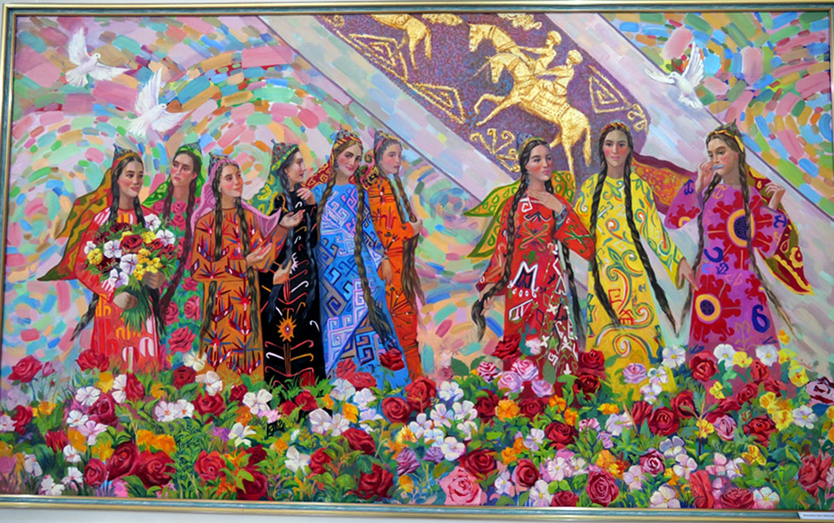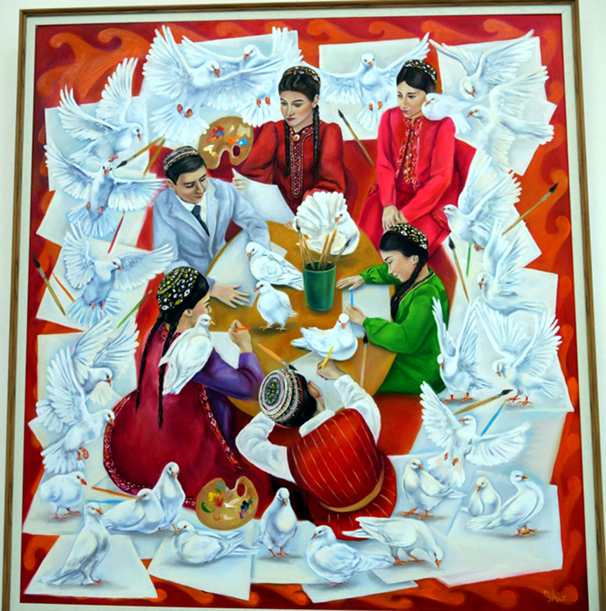 Almost every exhibition in the gallery of the Academy promises a pleasant discovery of a new work. Such a work at this exhibition was the painting by Annasoltan Hojayeva «Turkmenistan - the Homeland of Peace and Trust».