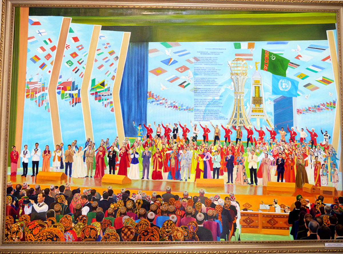The painting also depicts a fragment of the orchestra pit with musicians and cameramen among the audience. Everything is like in life. And above the stage, as a leitmotif to what was happening, Annasoltan wrote out Gurbanguly Berdimuhamedov’s poem «Turkmenistan – the Homeland of Peace and Trust», which brought a political tone to the picture.