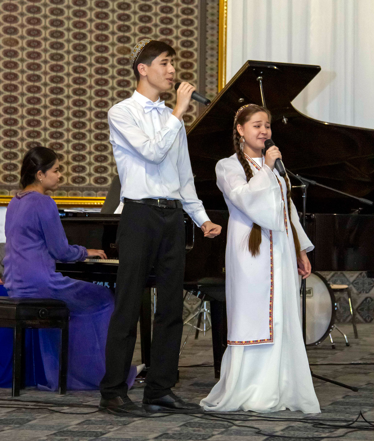 The poignant “Dialogue between Mother and Son” by Tatyana Zadorozhnaya was powerfully delivered by Ekaterina and Salikh Darchia. The conversation between the son and mother expressed boundless maternal love for her child. Emerging composer Tylla Shirova performed two original compositions, “Hasyr Dagy” and the romance “Prayer” based on the poems of Magtymguly, accompanied by oboist Eziz Garyagdyev.