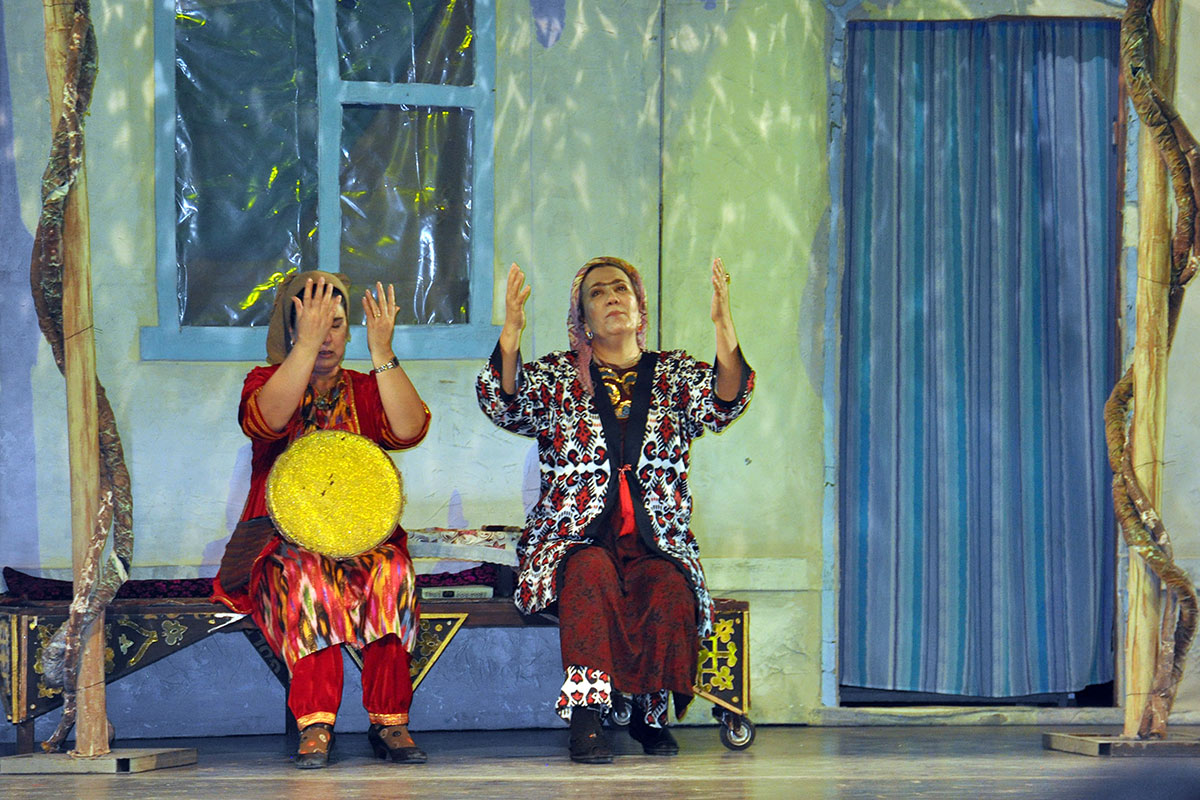The play opens with a lively dance by three elderly women who burst noisily into the courtyard accompanied by musicians. Choreographer Jemal Bazarova associated their entrance with the dominant role of mothers-in-law in the lives of daughters-in-law.