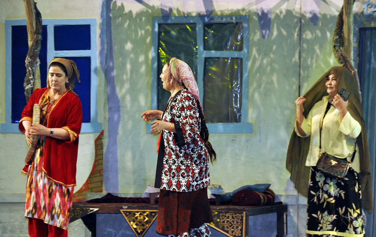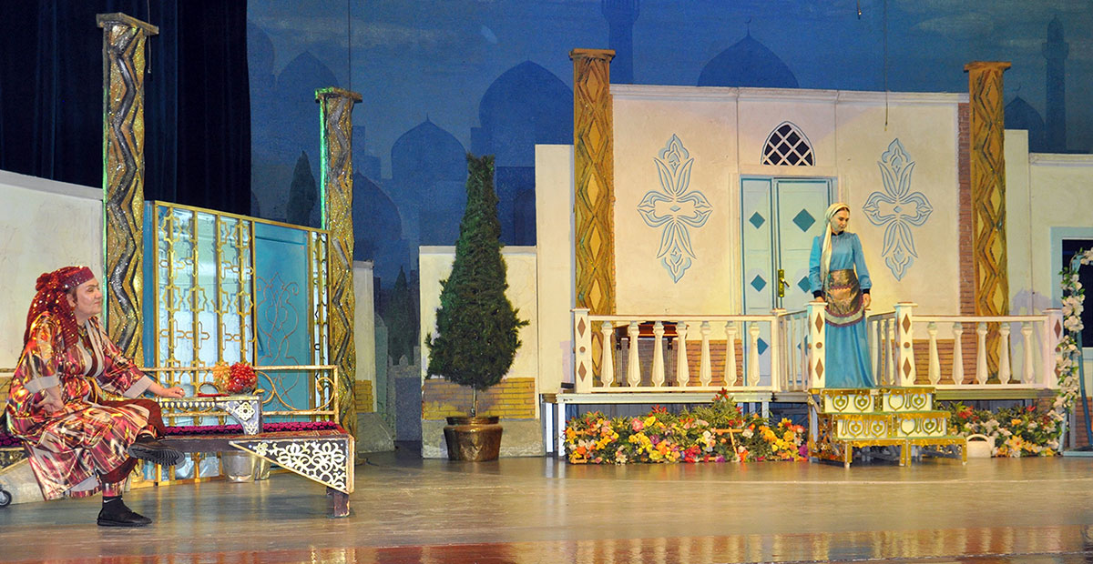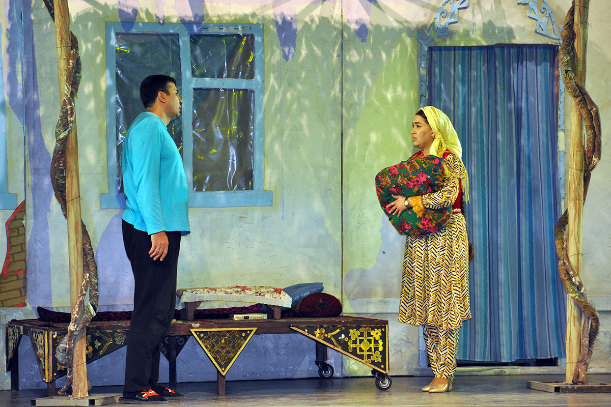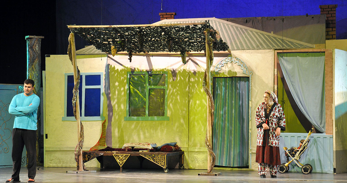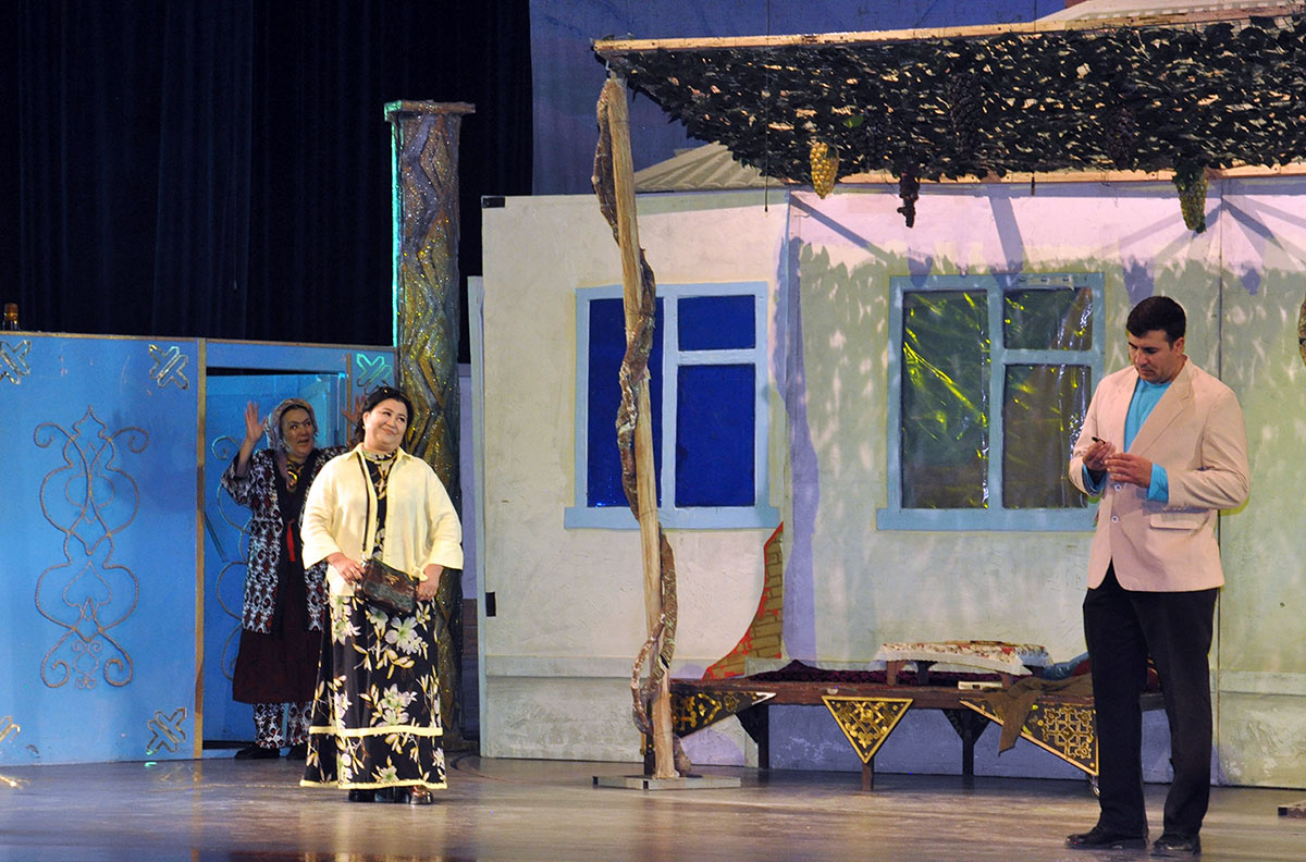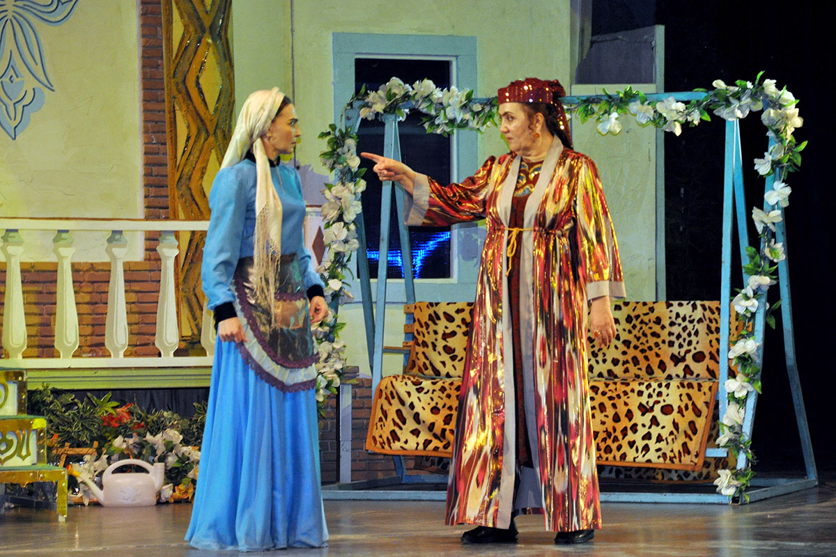 The production is directed by Nury Hudaygulyyev. This is his second play based on Uzbek dramaturgy, and both have been highly successful. Perhaps the secret lies in the fact that the director is deeply familiar with Uzbek life. While studying at the acting faculty of the A. Ostrovsky Tashkent Institute of Theatre and Fine Arts, Nury Hudaygulyyev lived for five years in a densely populated district of the city and absorbed Uzbek culture. Every character in the play is well known to him, and when characters are drawn from real life, the performance becomes authentic. Thanks to the director, all the actors involved in the musical comedy delivered excellent performances. The role of the main character, Khajan, was performed by Honored Artist of Turkmenistan Aysoltan Kovusova (understudy: Honored Artist Narjan Berdiyeva); her son was played by Oraz Orazov (understudy: Dovran Saryev); and the daughter-in-law by Nurgozel Gurbangeldiyeva (understudy: Sapargul Veliyeva).