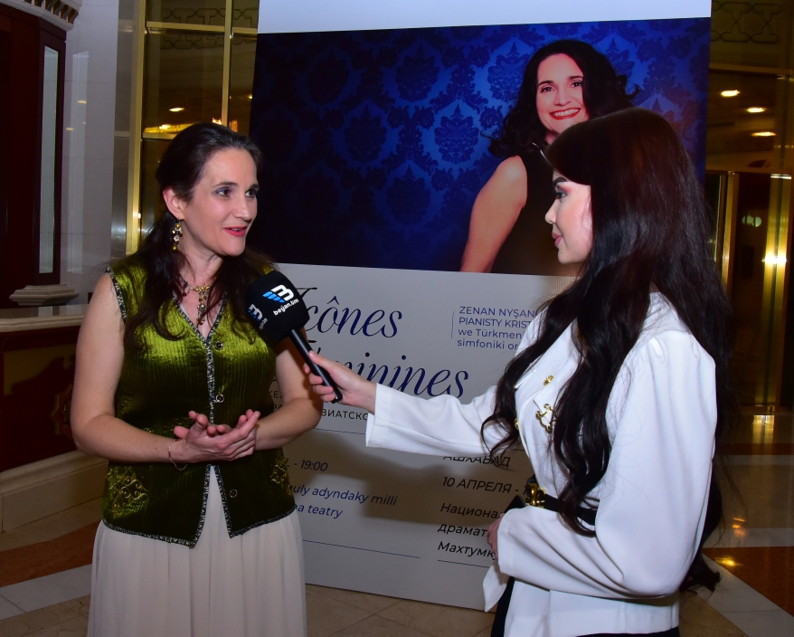 At the end of the evening, a press conference was held in the theatre foyer, where Christine Fonlupt told media representatives that she was on a Central Asian tour with a program dedicated to women. It was her first visit to Turkmenistan, and she expressed her delight at being in Ashgabat, noting its magnificent concert hall, wonderful audience, and talented symphony orchestra musicians, with whom she achieved complete mutual understanding from the very first rehearsal.