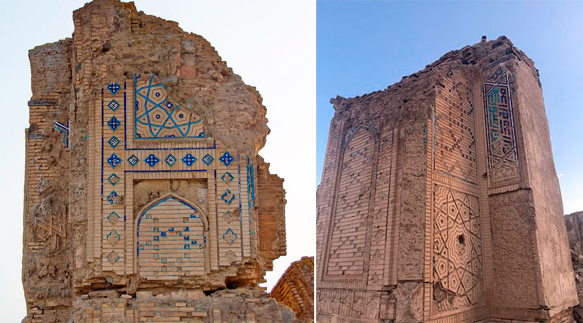 In her graphic reconstruction of the northern facade, Academician Pugachenkova highlighted two high two-tier minarets, stylistically continuing the lateral foundations of the portal. The mosaic decoration of the portal above the main arch, on which images of two serpentine dragons facing each other, were reproduced, were of the greatest value and artistic originality.