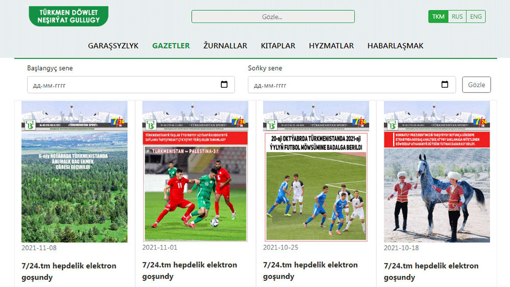 The 7/24.tm weekly magazine e-supplement appeared in June 2020. Currently, digital transformations are taking place in Turkmenistan. Turkmenistan Sport International Magazine was the first domestic periodical to produce a weekly supplement. The 7/24.tm weekly e-magazine offers sports news and interesting materials about the life of young people to its readers. The news bulletin is available on www. turkmenmetbugat.gov.tm and www. metbugat.gov.tm.