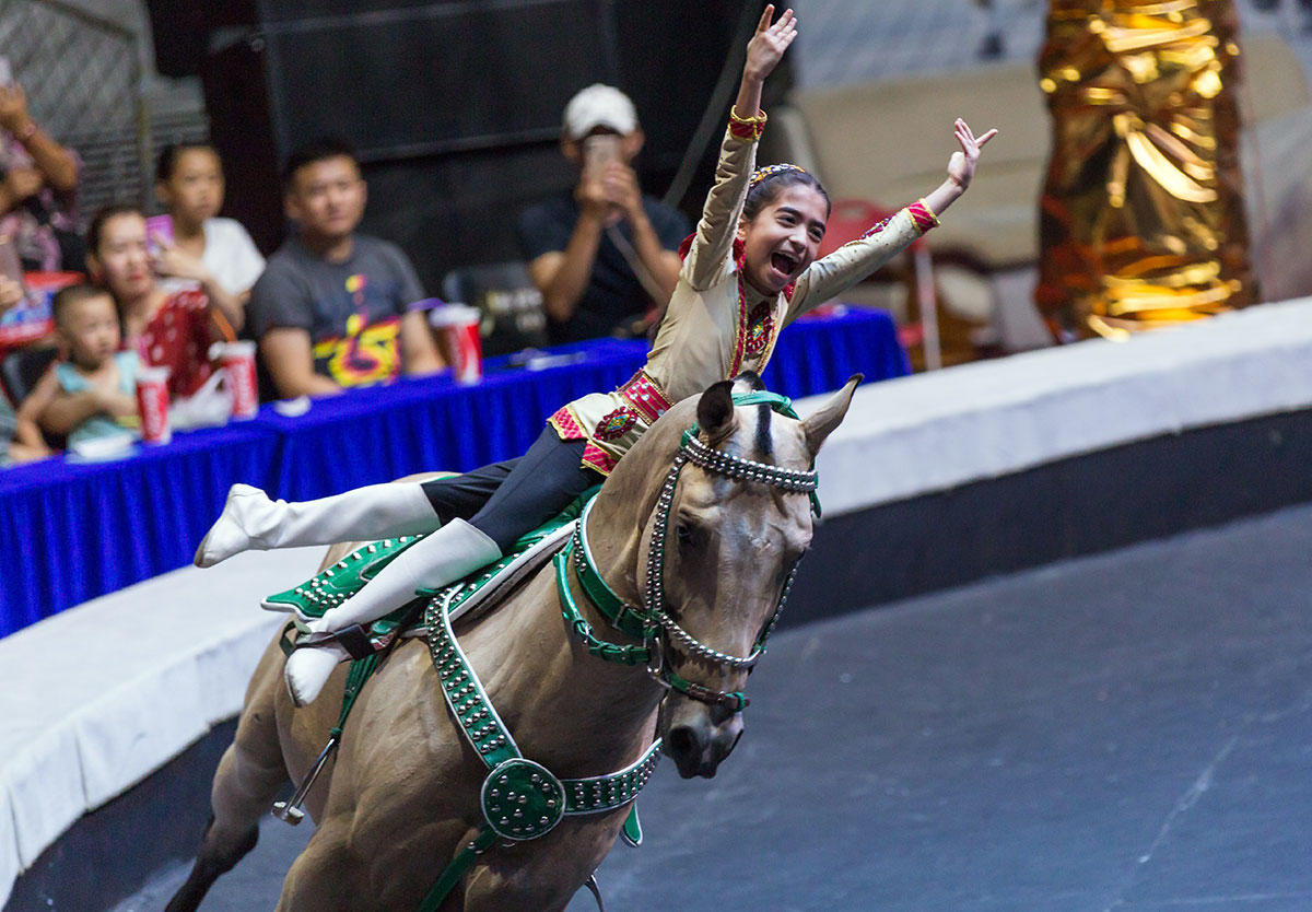 Medina Bayramdurdyyeva entered the circus arena at 5 years old. A small girl of fragile physique evoked touching feelings in the audience. But the young artist very neatly performed all the numbers entrusted to her and, not stopping there, expanded her repertoire. She sang and danced, did tricks on the ring, and then added training with goats and pigeons to her performances, now she is also a dashing rider.