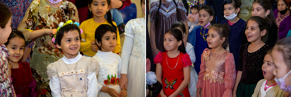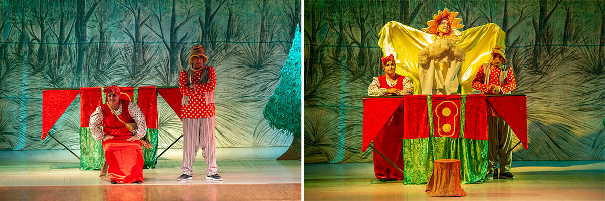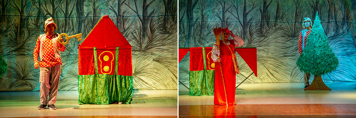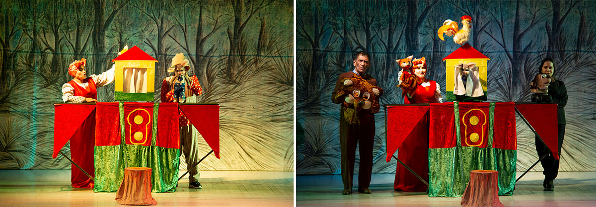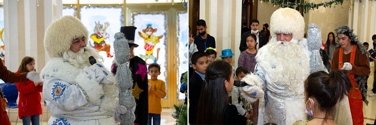 When Ayaz Baba and Garpamyk came out to the tree, it became even more fun. Ayaz Baba had many gifts in a big bag, and he gave them to children for singing a song or rhyme. Children helped Ayaz Baba to light the tree by loudly shouting magic words: «One! Two! Three!». And then Ayaz Baba invited the children to the Great Hall of the theater, where the puppets and artists prepared for them a performance based on the fairy tale "The Hare and the Fox".