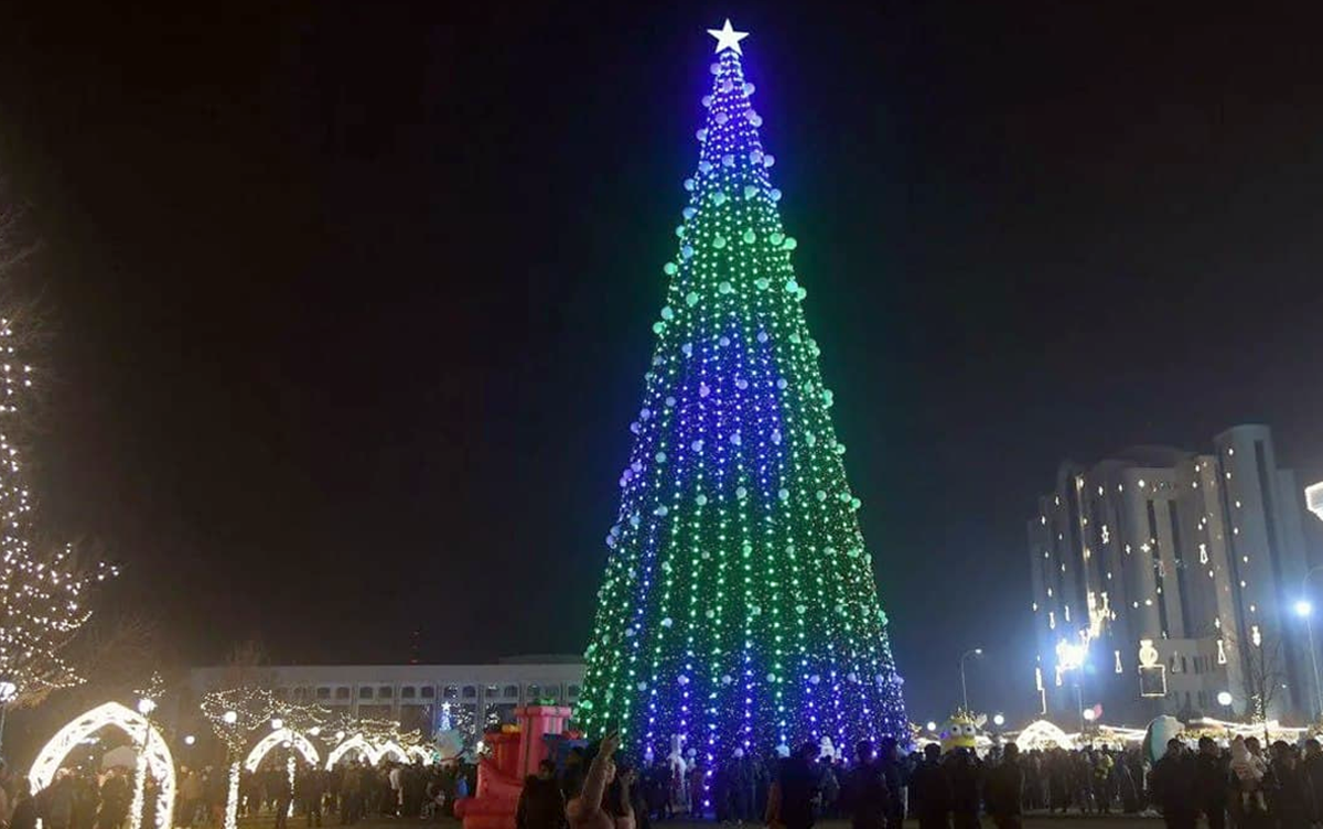In Kirgizstan, 25 -meters New Year tree is installed in the central square Ala-Too of Bishkek city. 14 thousand 200 meters of garlands, 7 thousand 500 meters of duralight, 8 thousand 420 meters of royal tinsel, and 296 toys in a shape of snowflakes and glowing balls, were used for decoration of the holiday tree.
