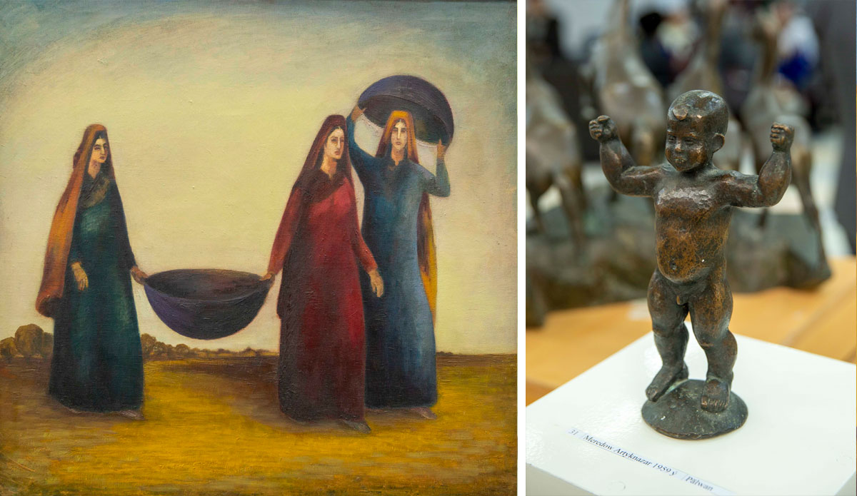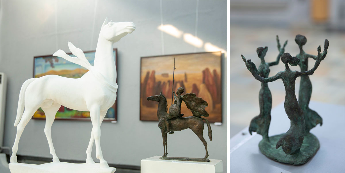 Artyknazar, the younger brother of Saparmammet Meredov, chose his direction in art - sculpture. Of the 127 works exhibited by him, most of the horses, and this is no accident. 10 years ago, Artyknazar Meredov was awarded 1st place in the nomination of sculpture in the State Competition dedicated to the Ahal-Teke horse. But not only the horse, light as the wind, excites the sculptor. In the sculptural exposition of the exhibition, among a number of interesting works, the round dance of girls, similar to a flower, delights with its beauty. And literally all visitors are captivated by a fragile girl jumping a rope.