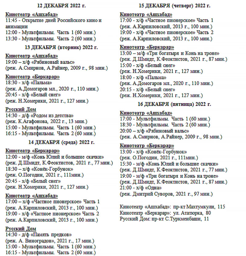 The week of Russian cinema and animation, organized by the Embassy of the Russian Federation in Turkmenistan and the Ministry of Culture of the country, will last until December 16 inclusive.