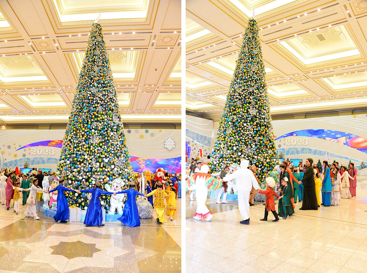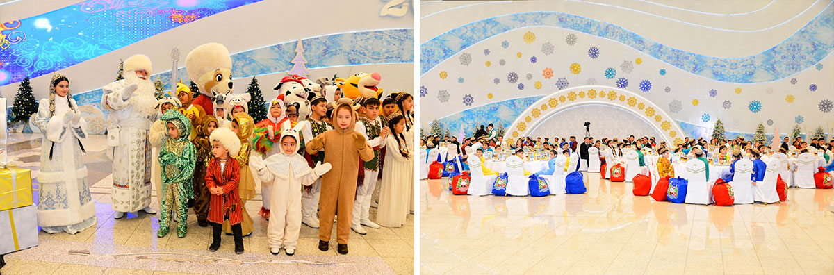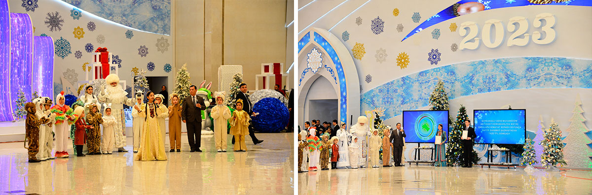 Today, near the large fir tree installed in the hall of the Chamber of Commerce and Industry, the festive atmosphere prevails. Avaz baba, Garpamyk, rabbit, a symbol of the upcoming year as well as representatives of a number of ministries, departments and public organizations came to congratulate children of “Döwletliler Köşgi” Palace with the New Year.