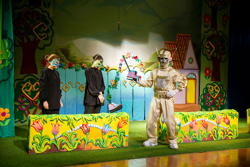 “For the most part, young talented actors are involved in the performance,” says director Maksat Altayev. “Young people in our theater learn how to handle different types of puppets, so that later on the stage they can skillfully convey the emotions and plasticity of their characters. The guys are working on themselves. For example, especially for the role of the Robot, the aspiring actor Bagtyyar Dollyev learned to move and dance like a robot.