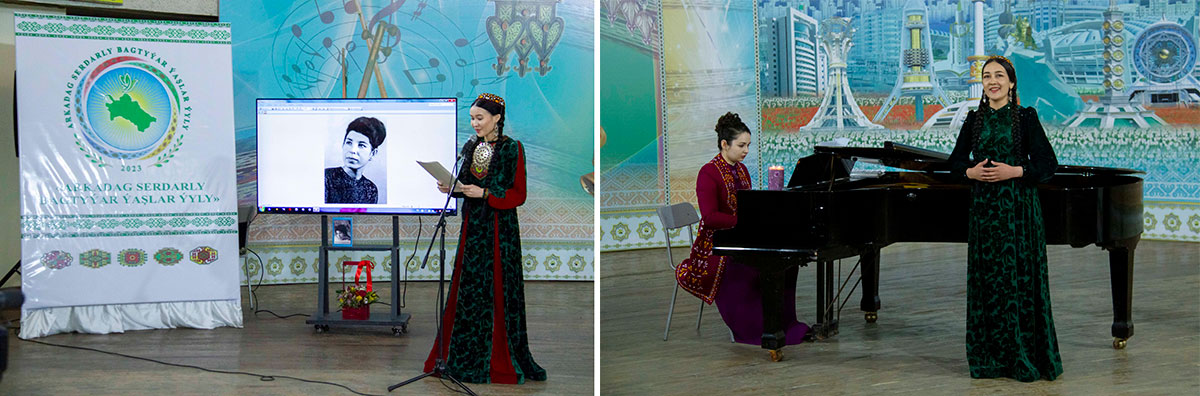 During the concert, the accompanist teacher of the Department of Special Piano Aylar Saparmyradova performed the author's work «Nocturne», addressed to the memory of Medeniyet Shahberdiyeva, as well as the work of Nury Halmamedov «To You». The friendship between Medeniyet Shahberdiyeva and Nury Halmamedov, as well as Atageldi Garyagdyyev, is evidenced by the photographs taken from the archive, which were broadcast on the screen. Professor of the Conservatory, People's Artist of Turkmenistan Atageldi Garyagdyyev shared his memories of the great singer.