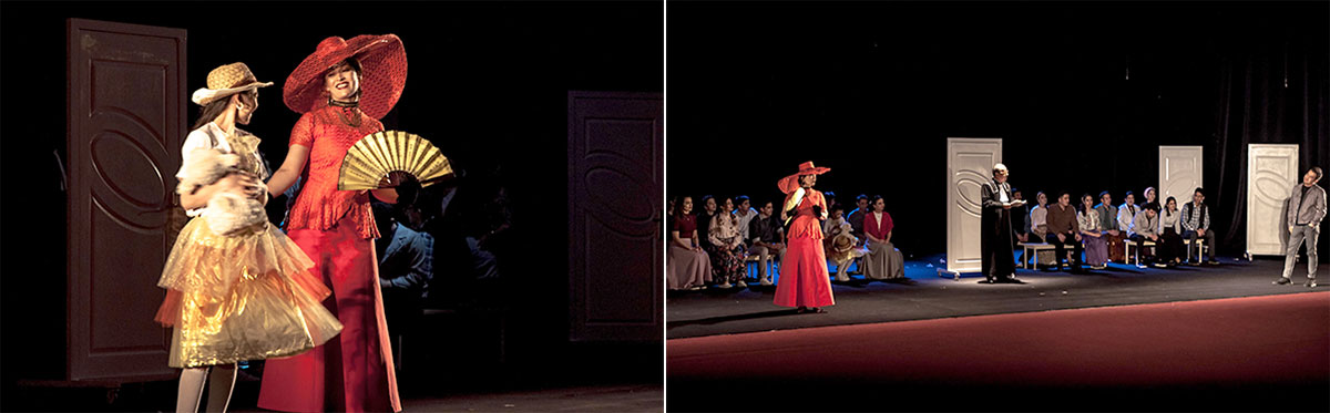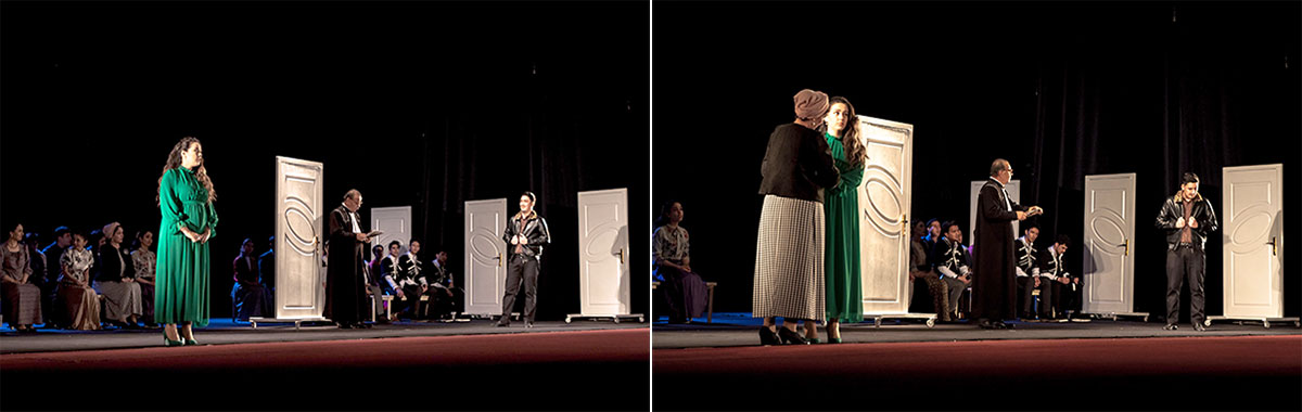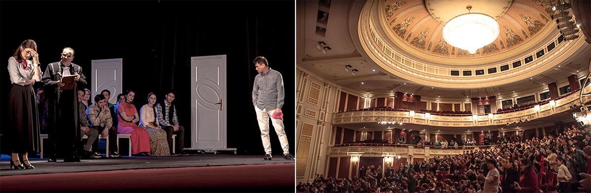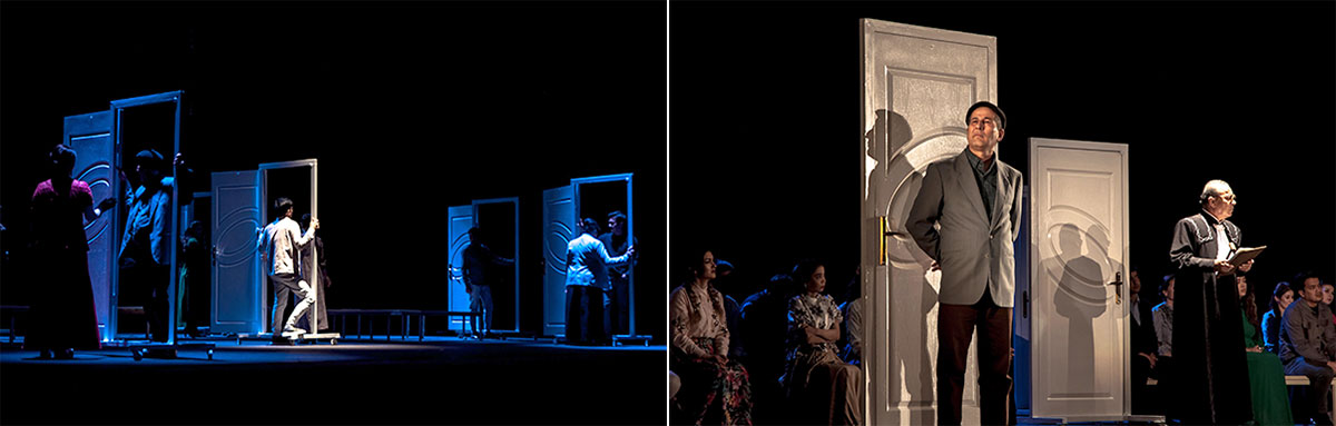 Director Mekan Jumabayev and production designer Maksat Amangylyjov, Honoured Worker of Culture of Turkmenistan, used ... doors in the design of the set design. In this case, the door is a symbolic object: through it you can enter into a happy story that develops between a man and a woman, but you can also exit. The presence of doors in the absence of walls creates a space filled with emptiness on the stage, so it is very important to get out of the empty space, and not enter it.