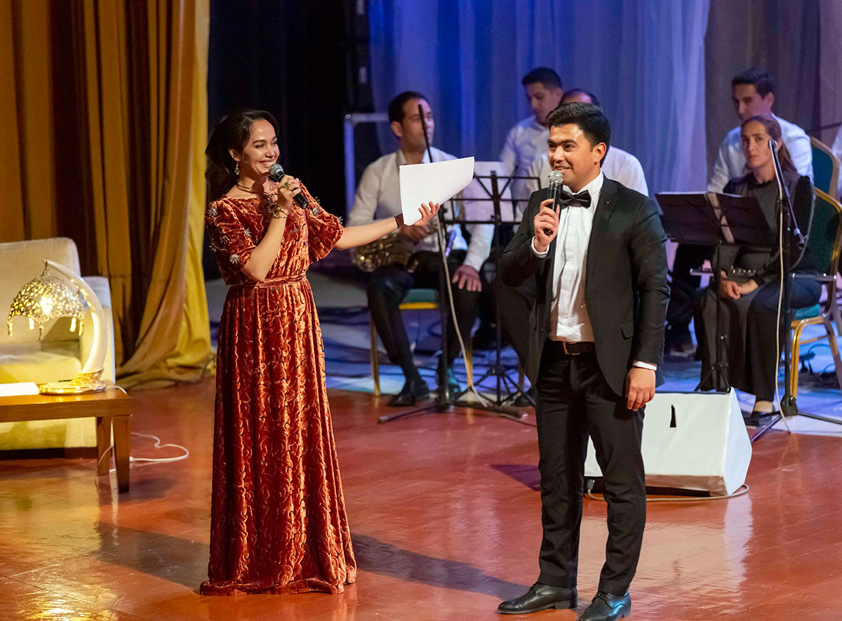 People's Artists of Turkmenistan Myrat Bayramgeldiyev and Gulnar Nuryyeva were the first to perform on the stage with their crown number «Telli Velli» from the movie «Arshin Mal Alan». A funny dialogue about money, as well as the artistic performance of the vocalists, brought smiles to the faces of all the spectators without exception.