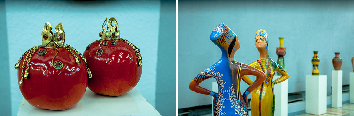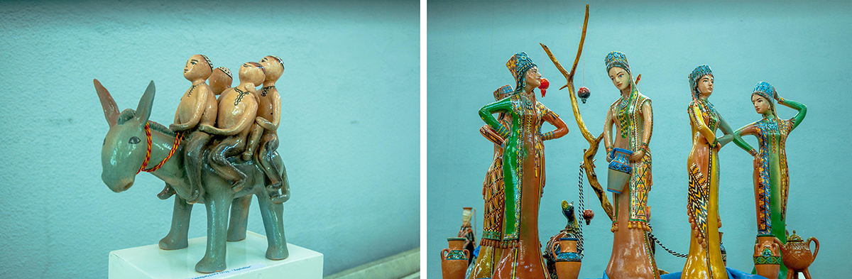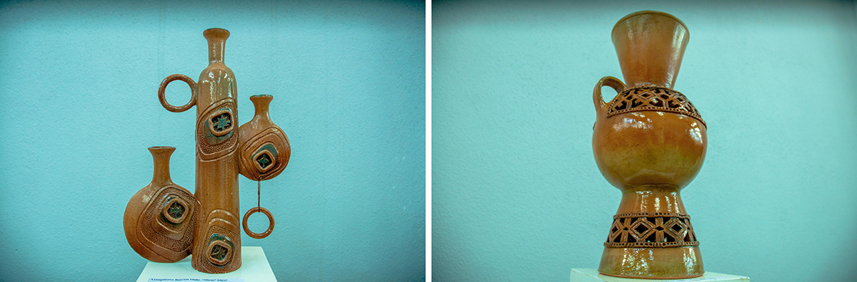 Bayram and Maral, although they work together, have different directions in ceramics. Bayram Annagulyyev's well-known work «The Feast of the Caravaneers» takes us back to the time of the Great Silk Road, and his exposition «Dinosaurs» - to the Mesozoic era. But no matter how good these works are, the main thing in Bayram's work is jugs. The artist treats it as a cult object that contributes to quenching thirst and continuing the life of mankind. What kind of jugs did Bayram not present at the exhibition - these are cone-shaped, and with legs, and with two necks. Hundreds of vessels, and none is alike.