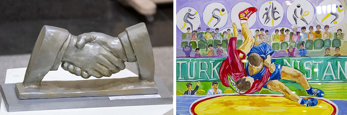 Sculptors also showed themselves well. Guvanchmurat Ataev presented an interesting work, sculpting a strong handshake of two palms. The originality of the idea and good workmanship attracted the visitors' attention to this work.
