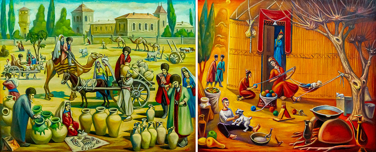 The artist Shokhrat Berdyev prefers to write on everyday topics. One of these works is “In the Grandmother’s Yard”. The granddaughter helps her grandmother to wind the yarn into balls, the grandmother shakes the cradle with her little grandson with her free foot. An older grandson plays with a puppy, and birds, that have flown into the yard, peck the remains of food from the puppy's bowl. The cat, curling up in a ball, sleeps sweetly in this company. In addition, pilav is being prepared for lunch.
