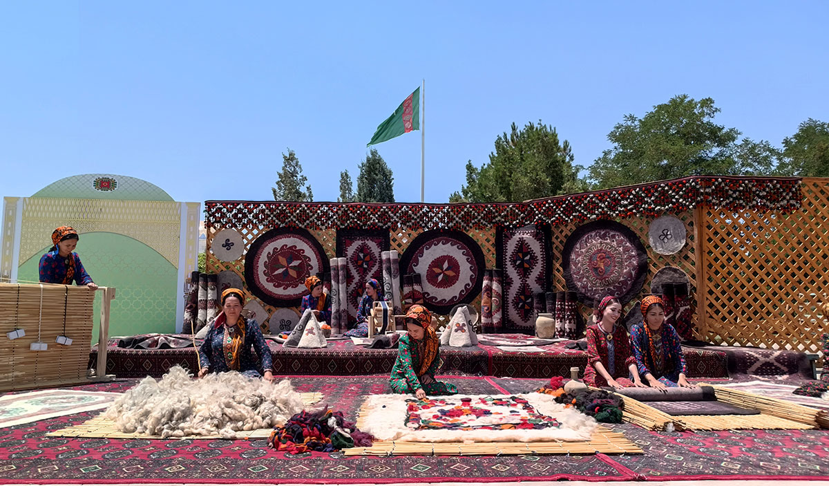 A festive exhibition was held in the square in front of the Mary Regional Library. The exhibition featured art canvases, portraits of the classic of Turkmen literature Magtymguly Pyragy, jewelry, and symbols of the national heritage of the people such as Turkmen carpets, wool products, handmade embroidery, musical instruments.