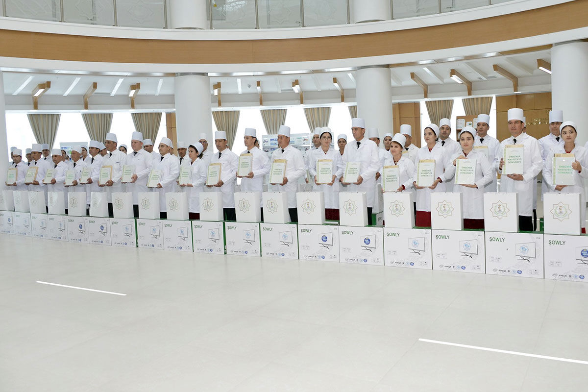On the occasion of today's significant event, the best healthcare workers were presented with memorable gifts and a new book by the National Leader of the Turkmen people, Chairman of the Halk Maslahaty Hero Arkadag «Ömrümiň manysynyň dowamaty».