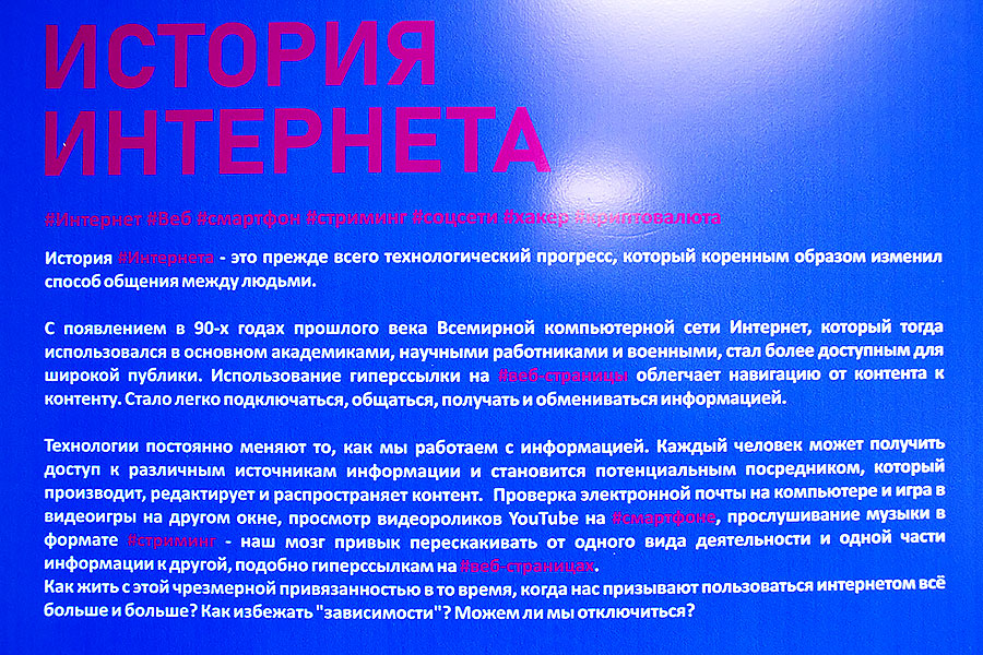 In total, 14 creative works were presented, combining digital works of art, documentaries, and video games. Thematically, the works are divided into several sections, the main of which are "The History of the Internet" and "The place of man in the material and virtual ecosystem".