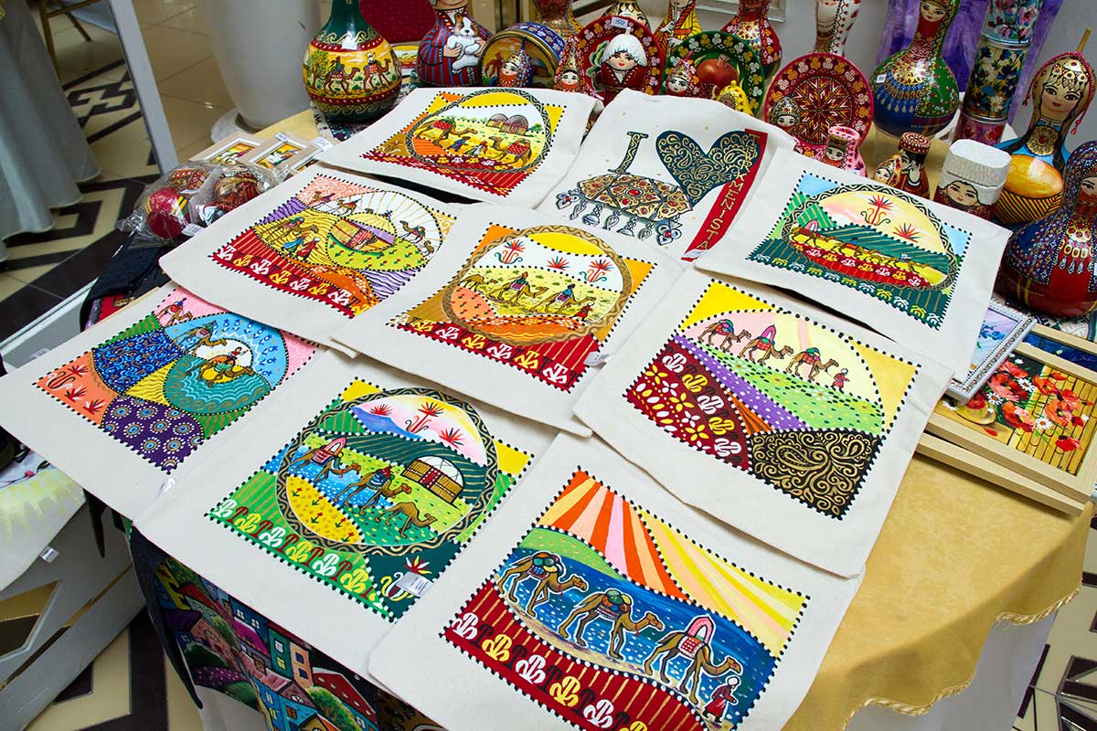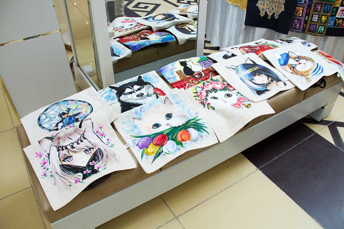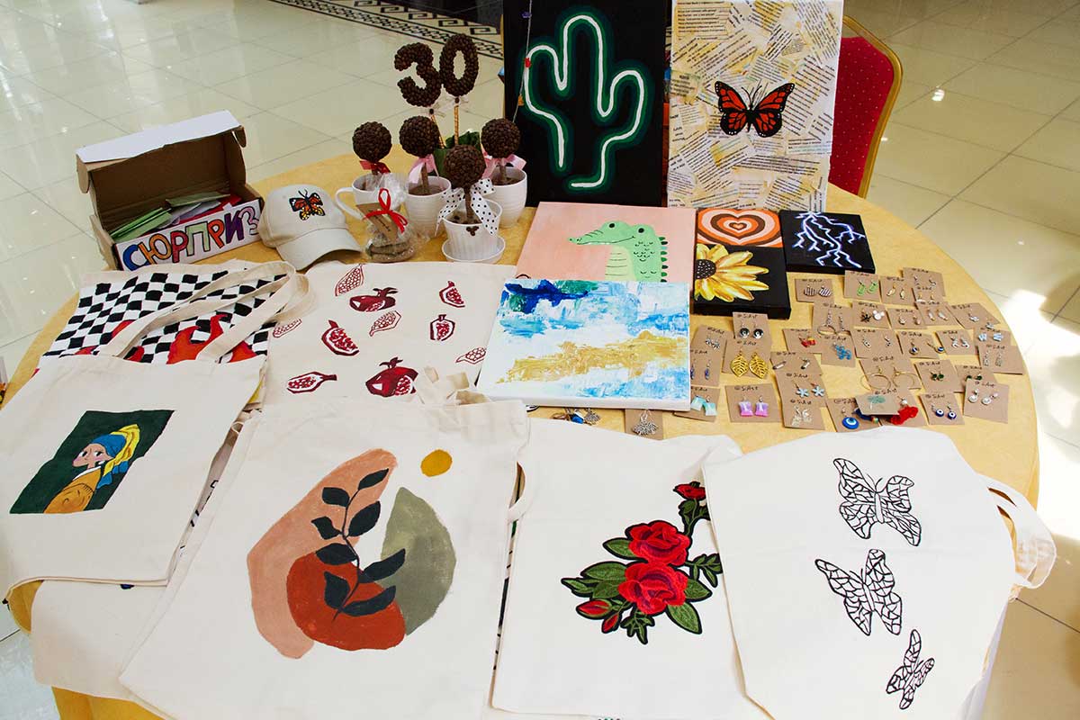 The fair accommodated all kinds of colorful products on 25 tables. The first salesperson we approached was 13-year-old Shirin Artykova. She introduced shopping bags to the visitors. This - ordinary calico bags, decorated with appliqués drawn Width with acrylic paints. Among them is a copy of the painting "Girls with pearl earring "Vermeer, cartoon characters, exotic plants. Eco-friendly shoppers that come to replace plastic bags, you can fearlessly wash in washing machines.