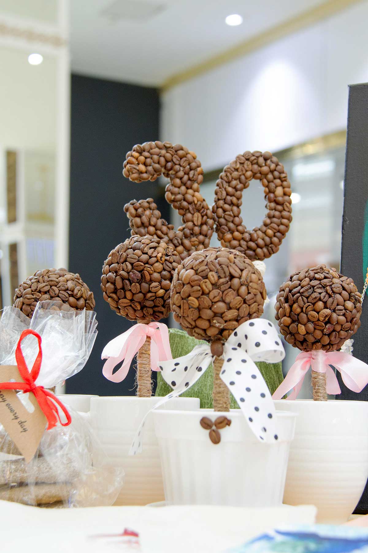 On the table at Shirin among various handicrafts - topiary coffee (tree of happiness). A pot with a plant lined with coffee beans, installed in the kitchen. A few drops of water are enough, and topiary will emit a wonderful aroma of coffee that will block any unpleasant kitchen smell.