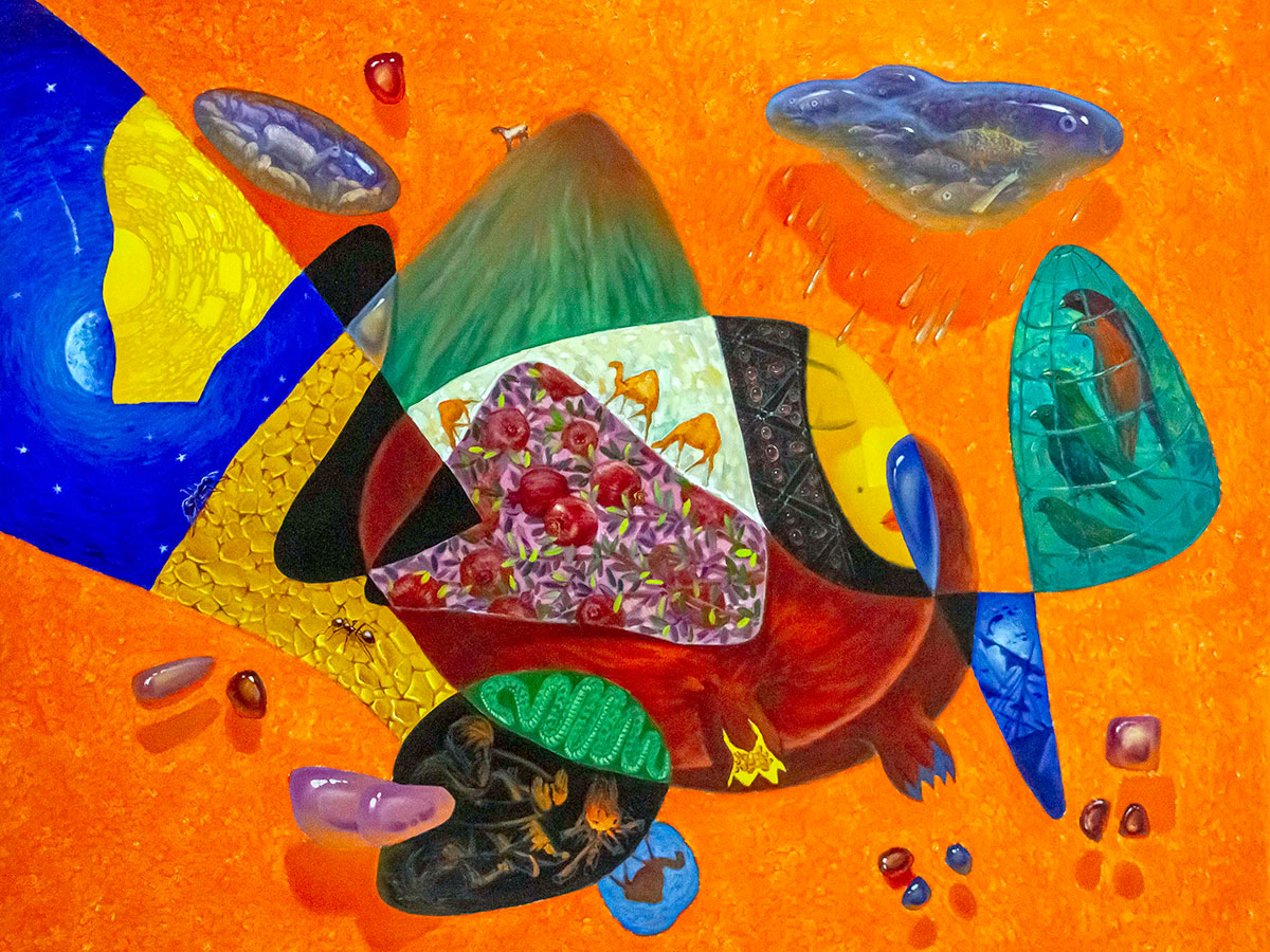 The exhibition begins with the creative work of Gahryman Gochmyradov «Who are you»? The plot is based on the title of one of Magtymguly’s poems. The artist combined many objects in his painting, and at first glance it began to resemble a rebus, made in the collage style.