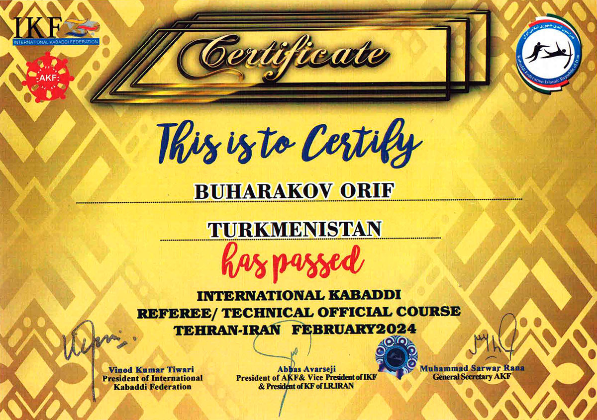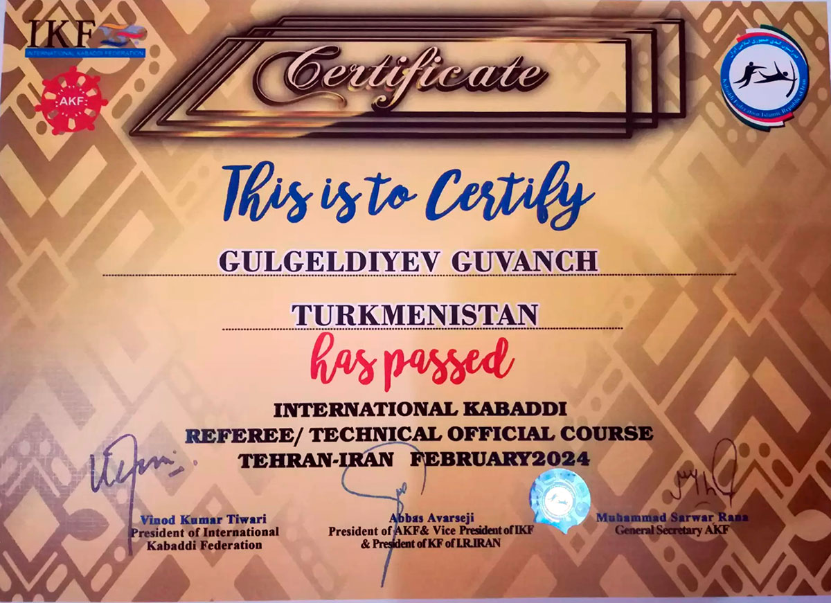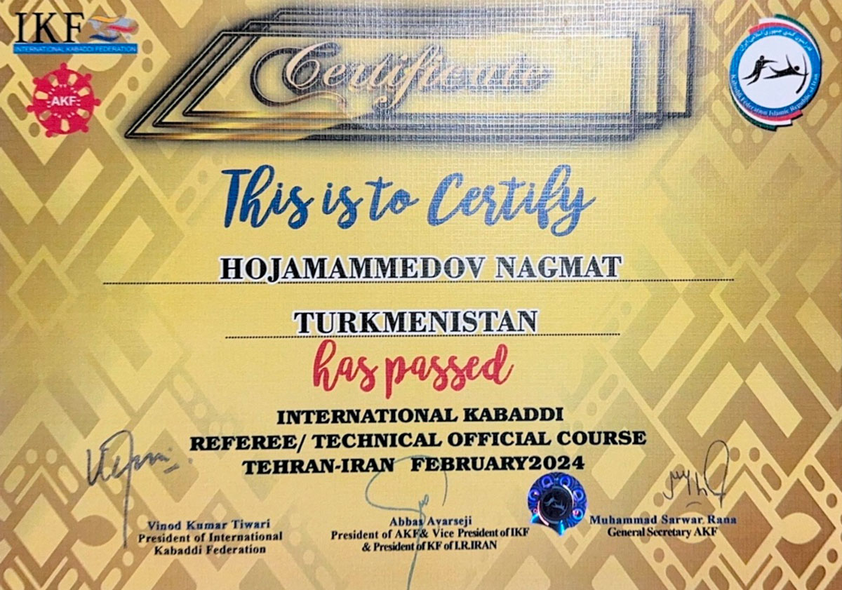 Over the course of three days, the seminar participants attended an educational course on the rules and other aspects of the game of kabaddi and took part in practical exercises to improve refereeing. After successfully passing the exam on the final day of the seminar, representatives of Turkmenistan received certificates giving them the right to judge any international competition in four types of kabaddi - traditional (7x7), included in the program of the Summer Asian Games, beach (4x4), included in the program of the Beach Asian Games, kabaddi ( 5x5), part of the Asian Indoor Games and Martial Arts and Kabaddi (circular style), played by teams of 10 players.